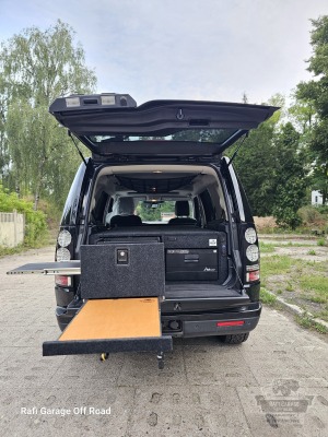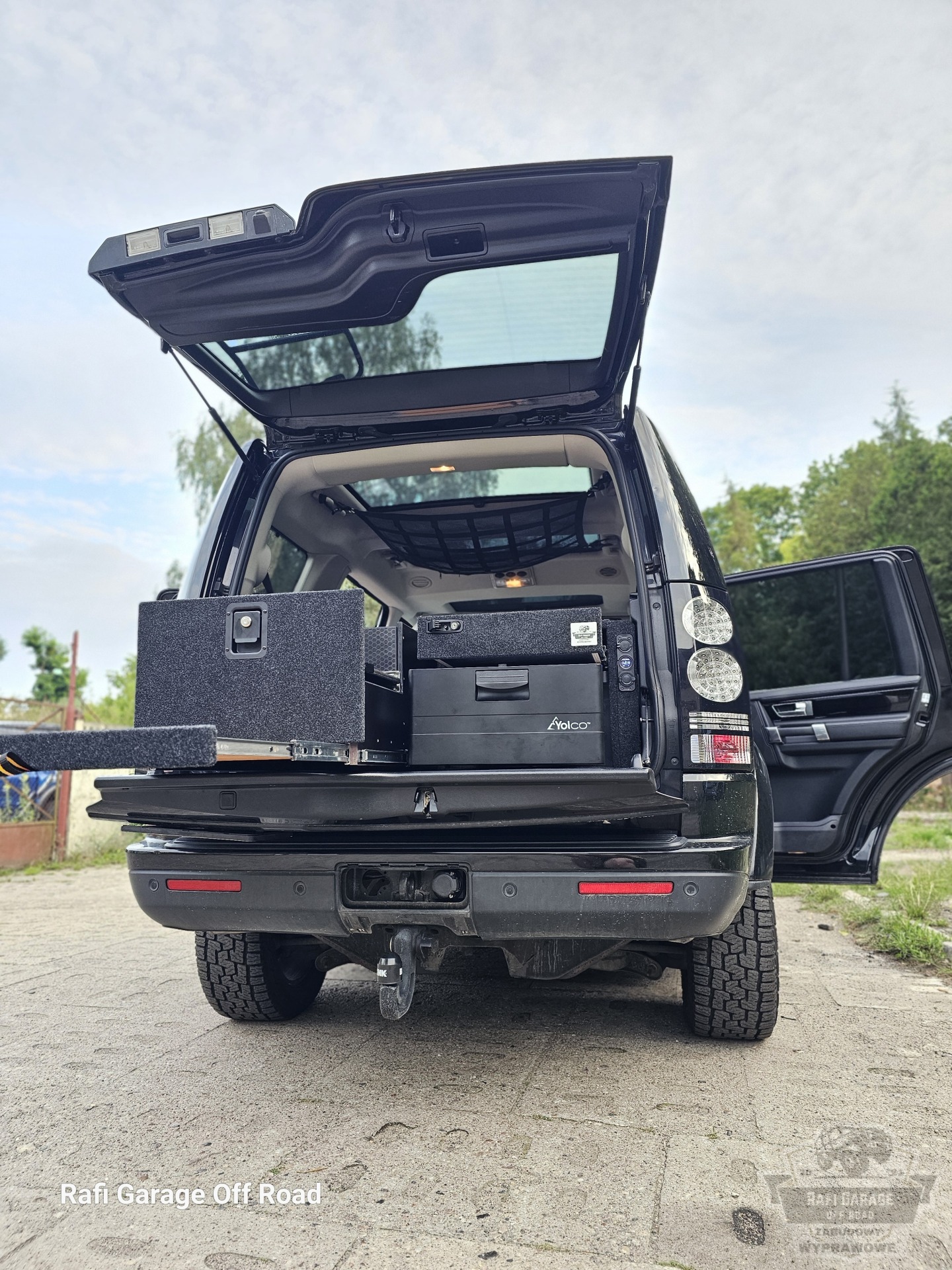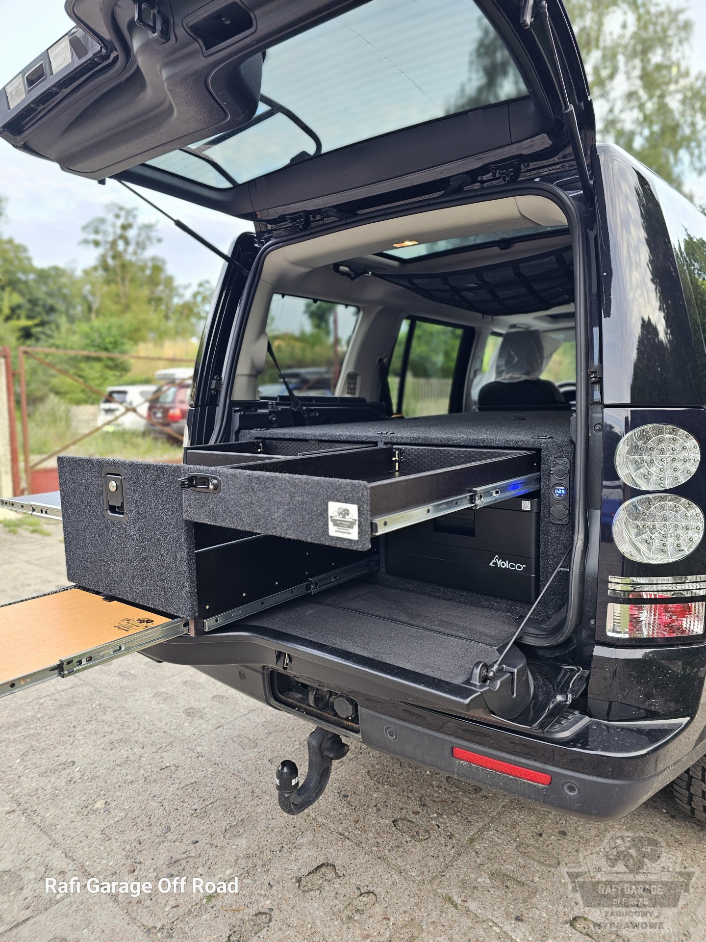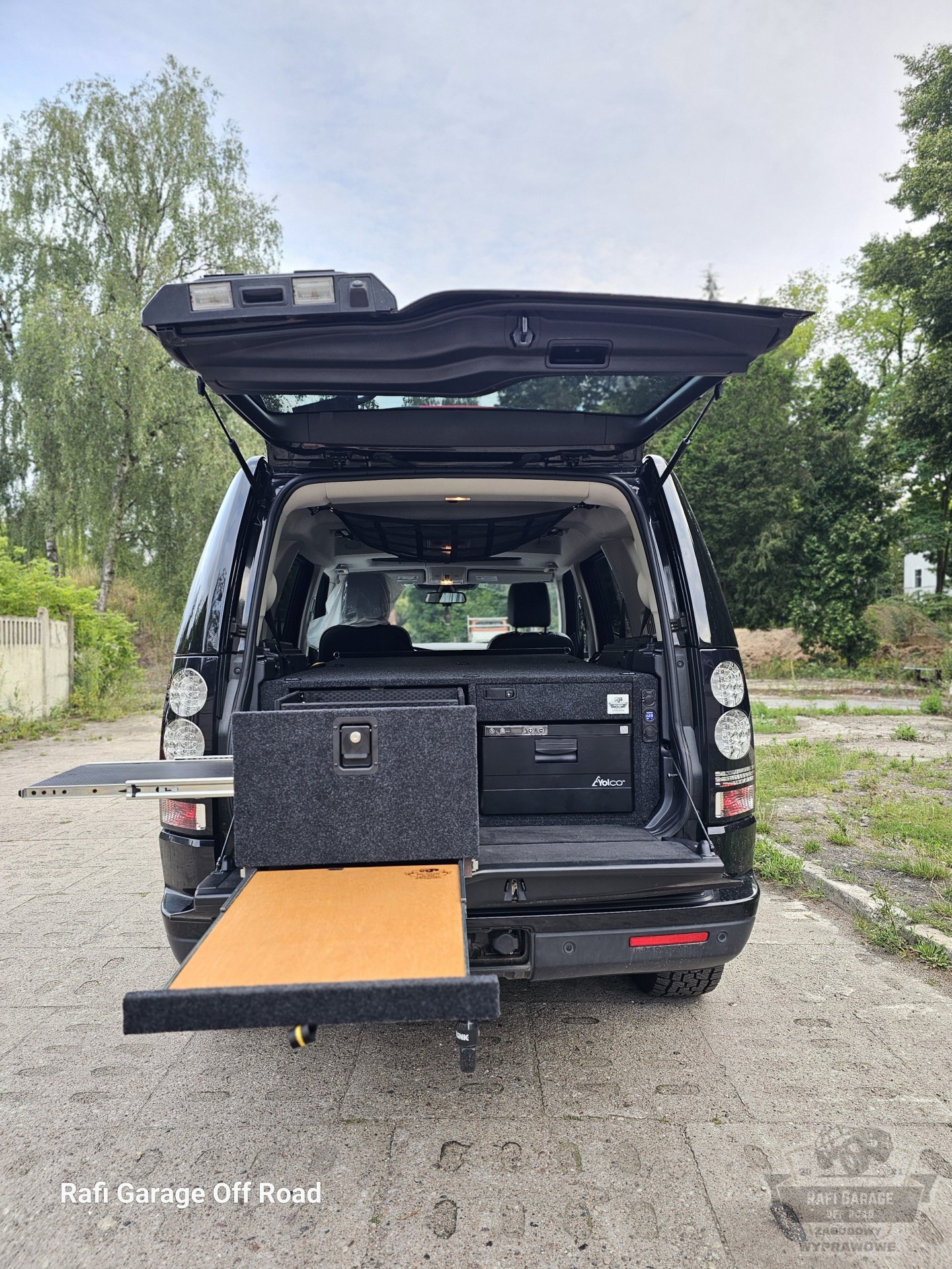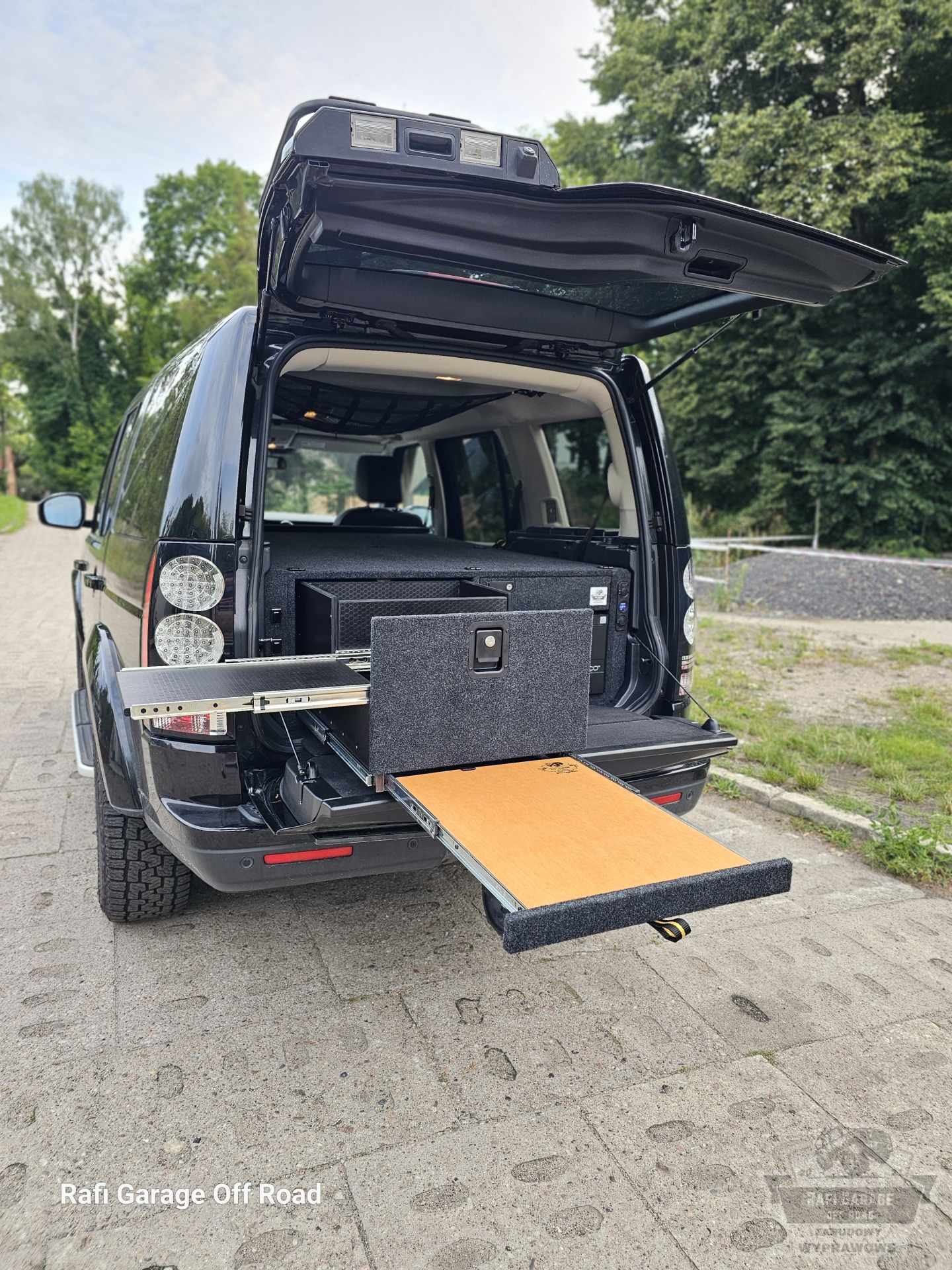 Zabudowa wyprawowa do przestrzeni bagażnika Land Rover Discovery 4 z funkcją spania, modułem kuchennym, lodówką szufladową Yolco CB30a oraz systemem wodnym 60L z automatycznym napełnianiem. W pełni zintegrowana instalacja elektryczna i 6 punktów mocowania bagażu.