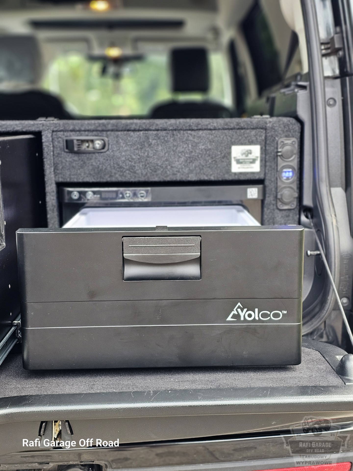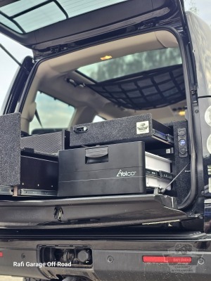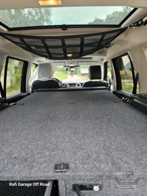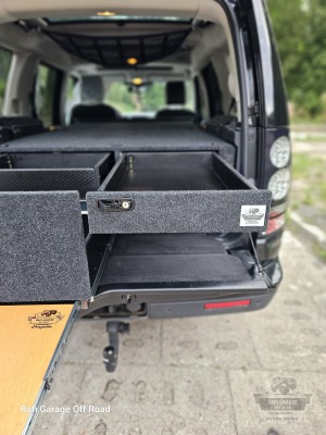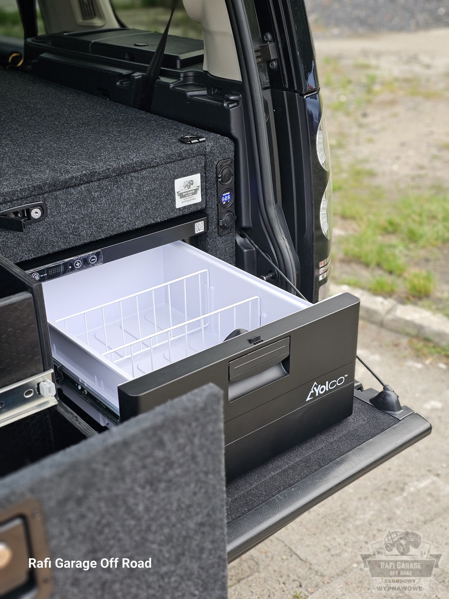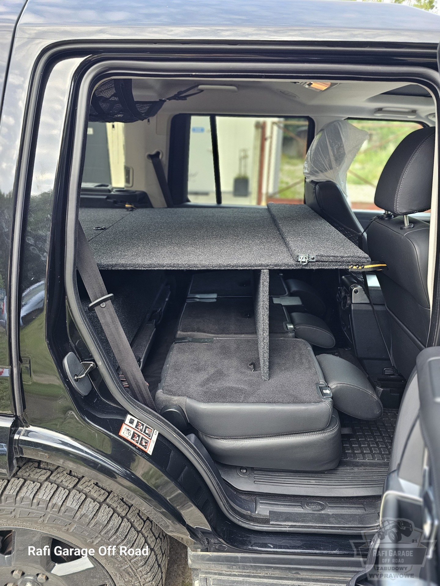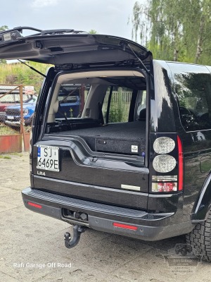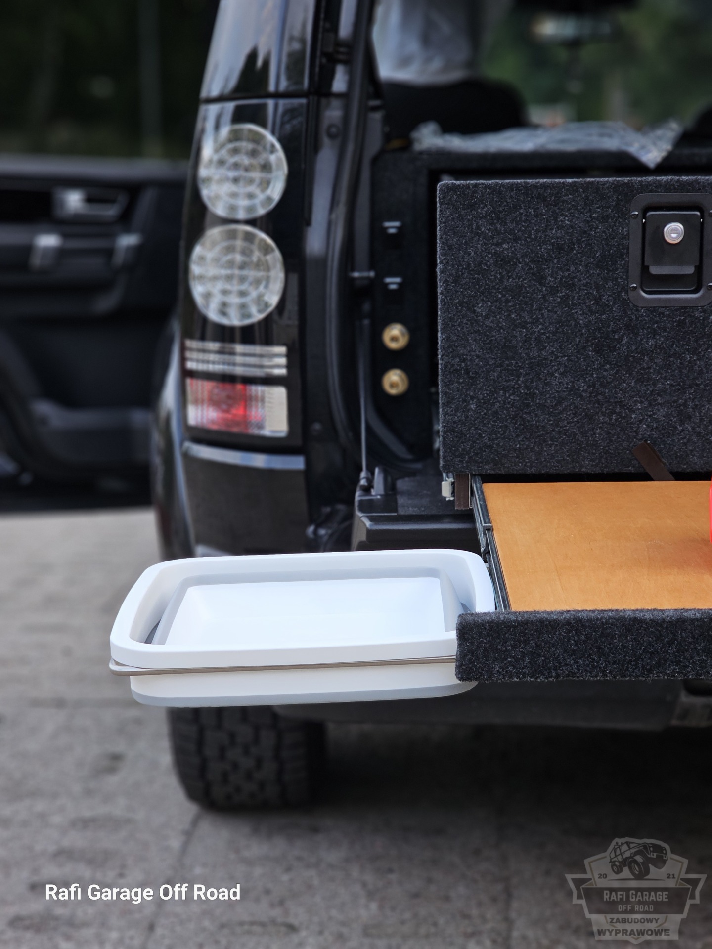 Zabudowa wyprawowa do przestrzeni bagażnika Land Rover Discovery 4 z funkcją spania, modułem kuchennym, lodówką szufladową Yolco CB30a oraz systemem wodnym 60L z automatycznym napełnianiem. W pełni zintegrowana instalacja elektryczna i 6 punktów mocowania bagażu.