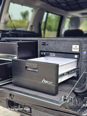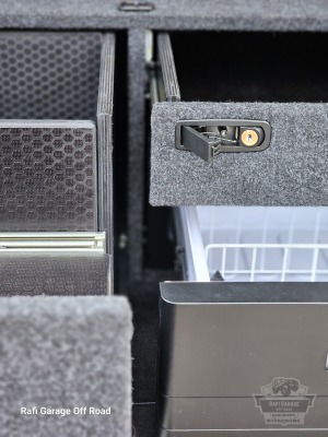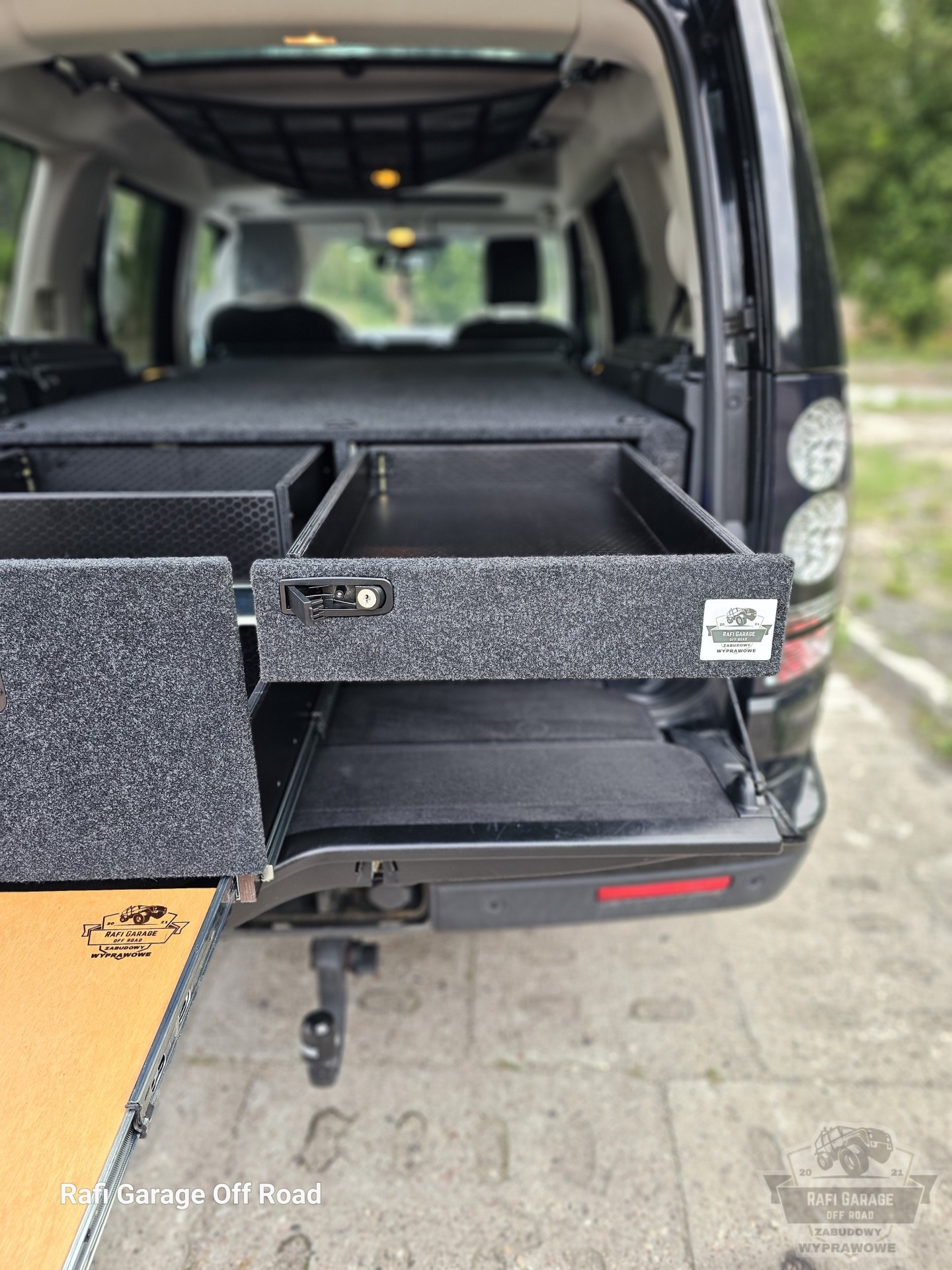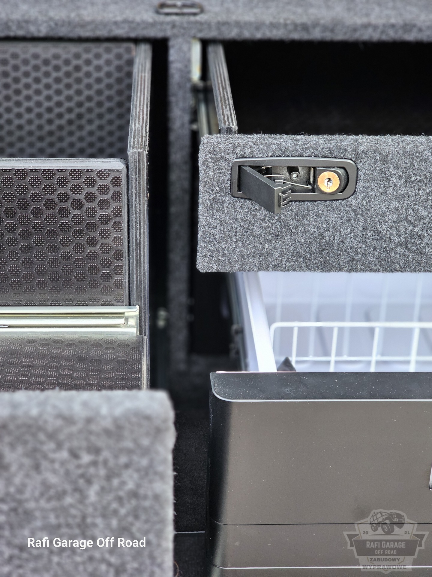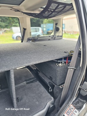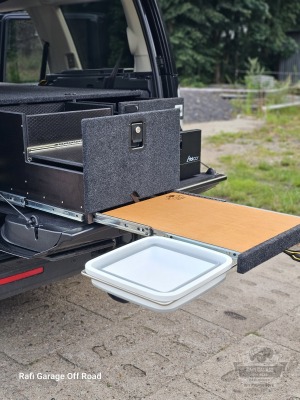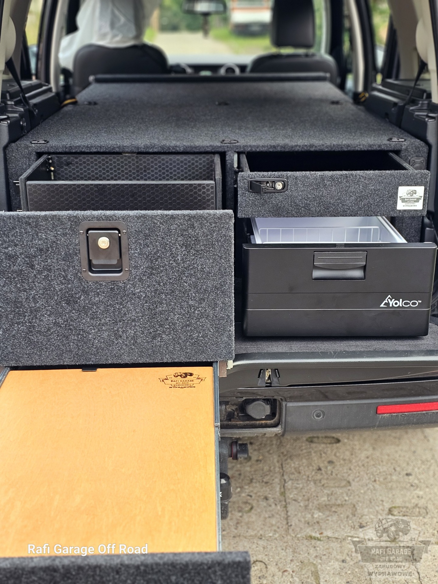 Kompletna zabudowa wyprawowa wykonana w przestrzeni bagażnika pojazdu 4x4. Konstrukcja przystosowana do użytkowania w warunkach terenowych i długich wyjazdach overlandingowych. Całość wykonana z wodoodpornej płyty laminowanej, tapicerowana w kolorze grafitowym.