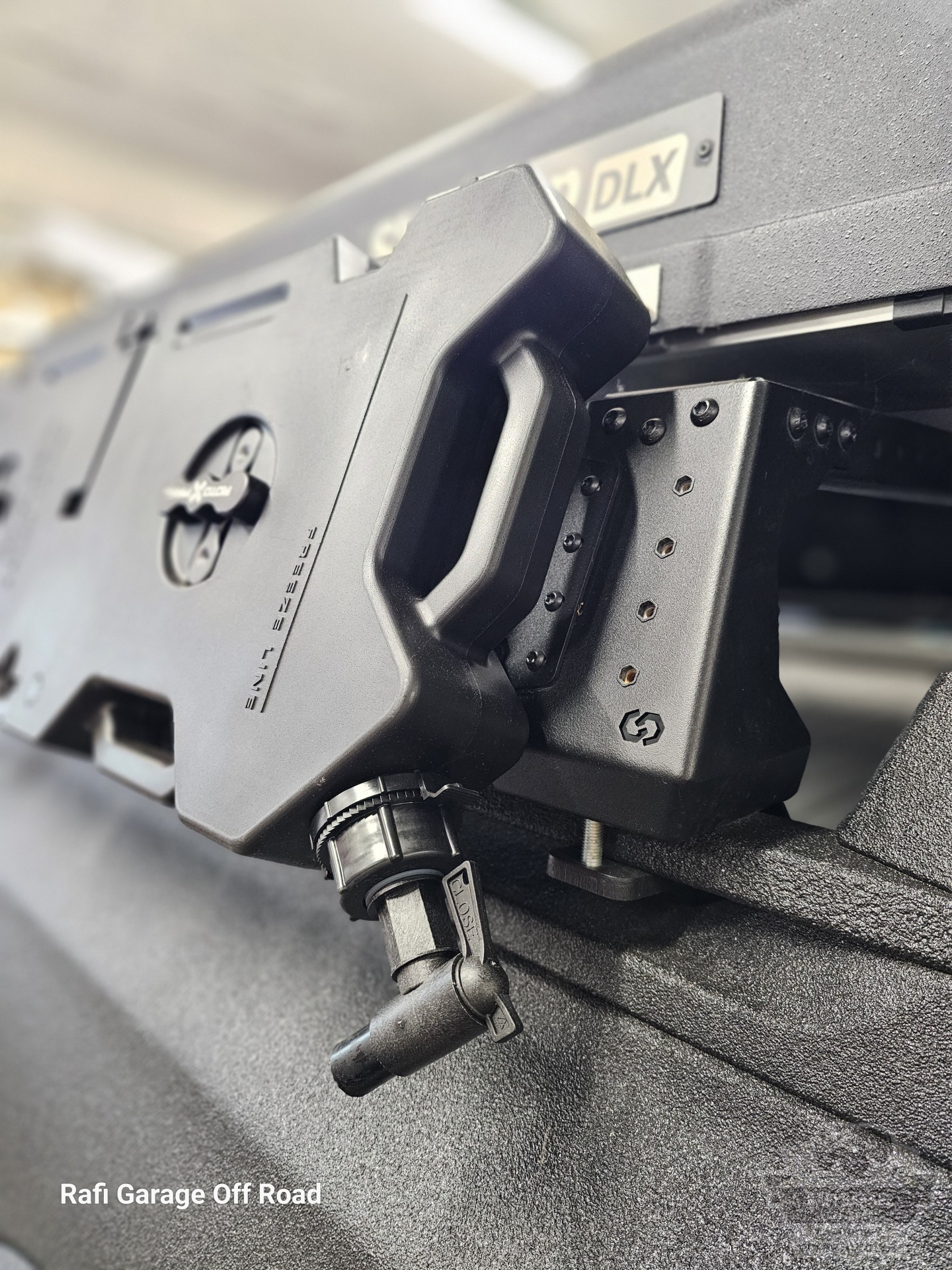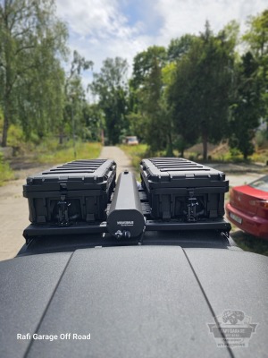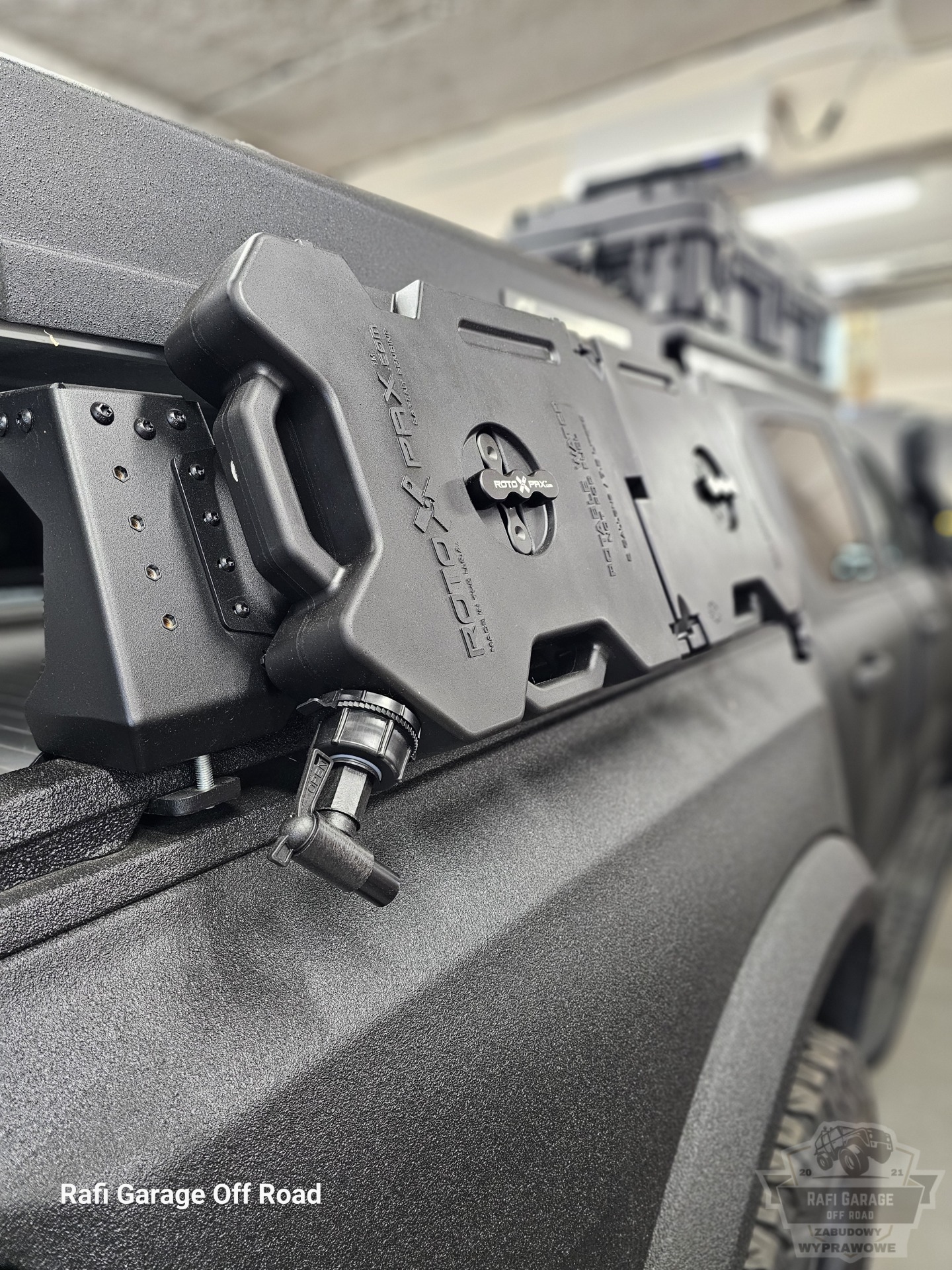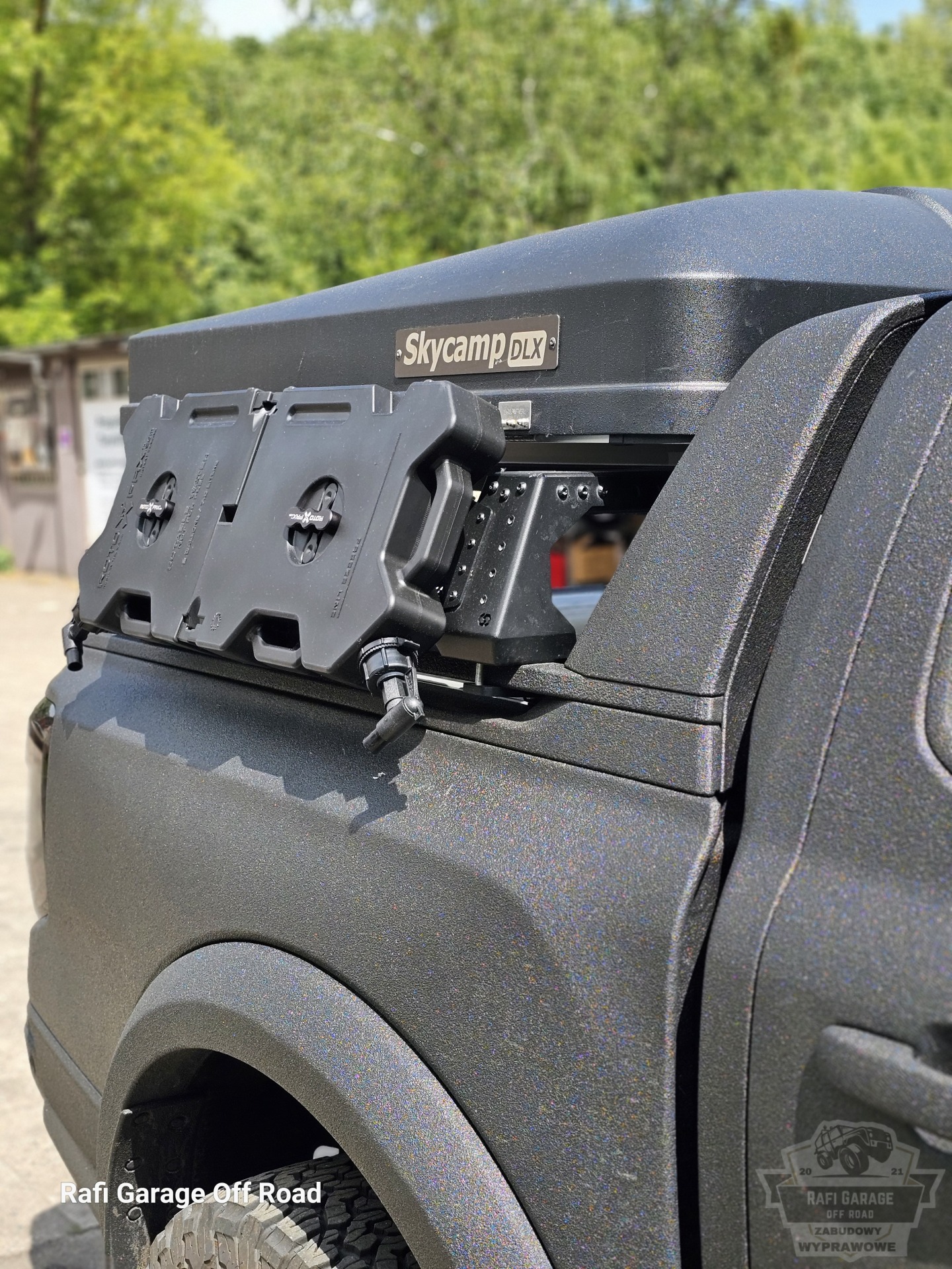 - Montaż zestawu dwóch kanistrów na wodę Rotopax z mocowaniami, kranikami oraz instalacją na konstrukcji na pace