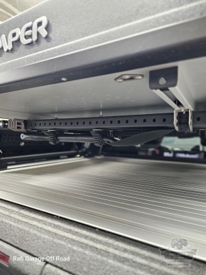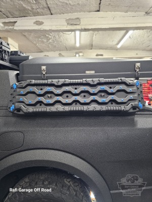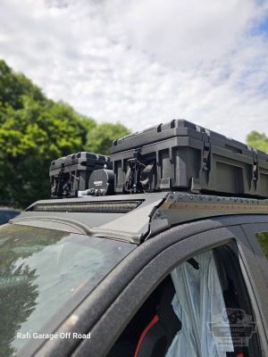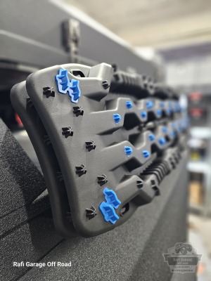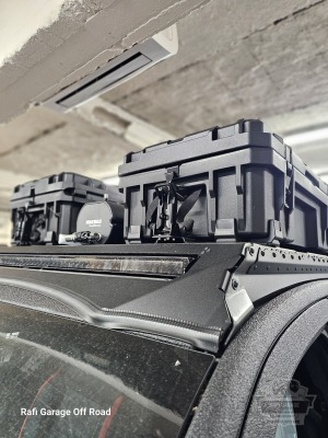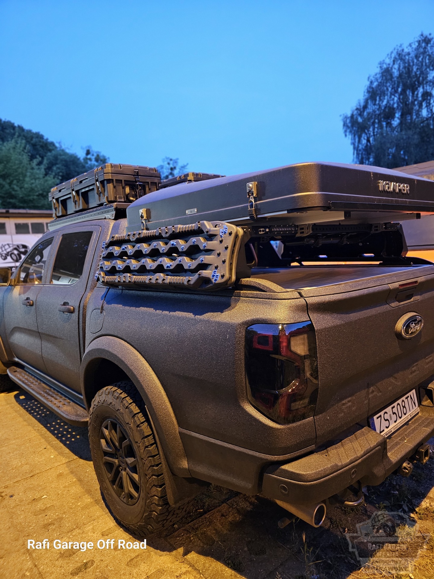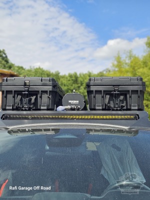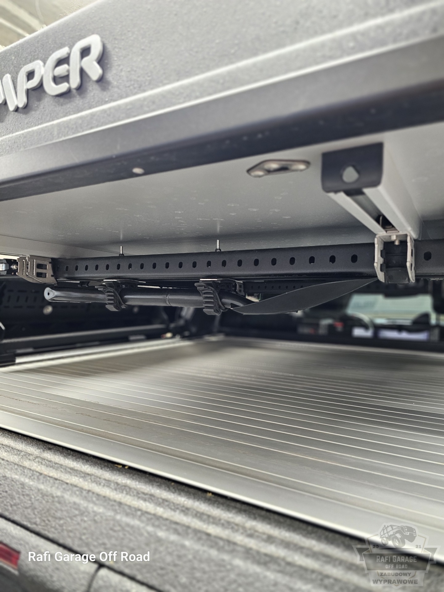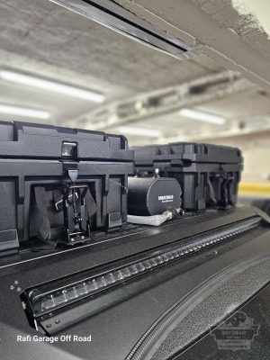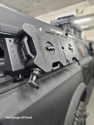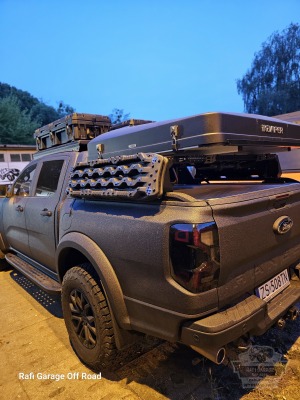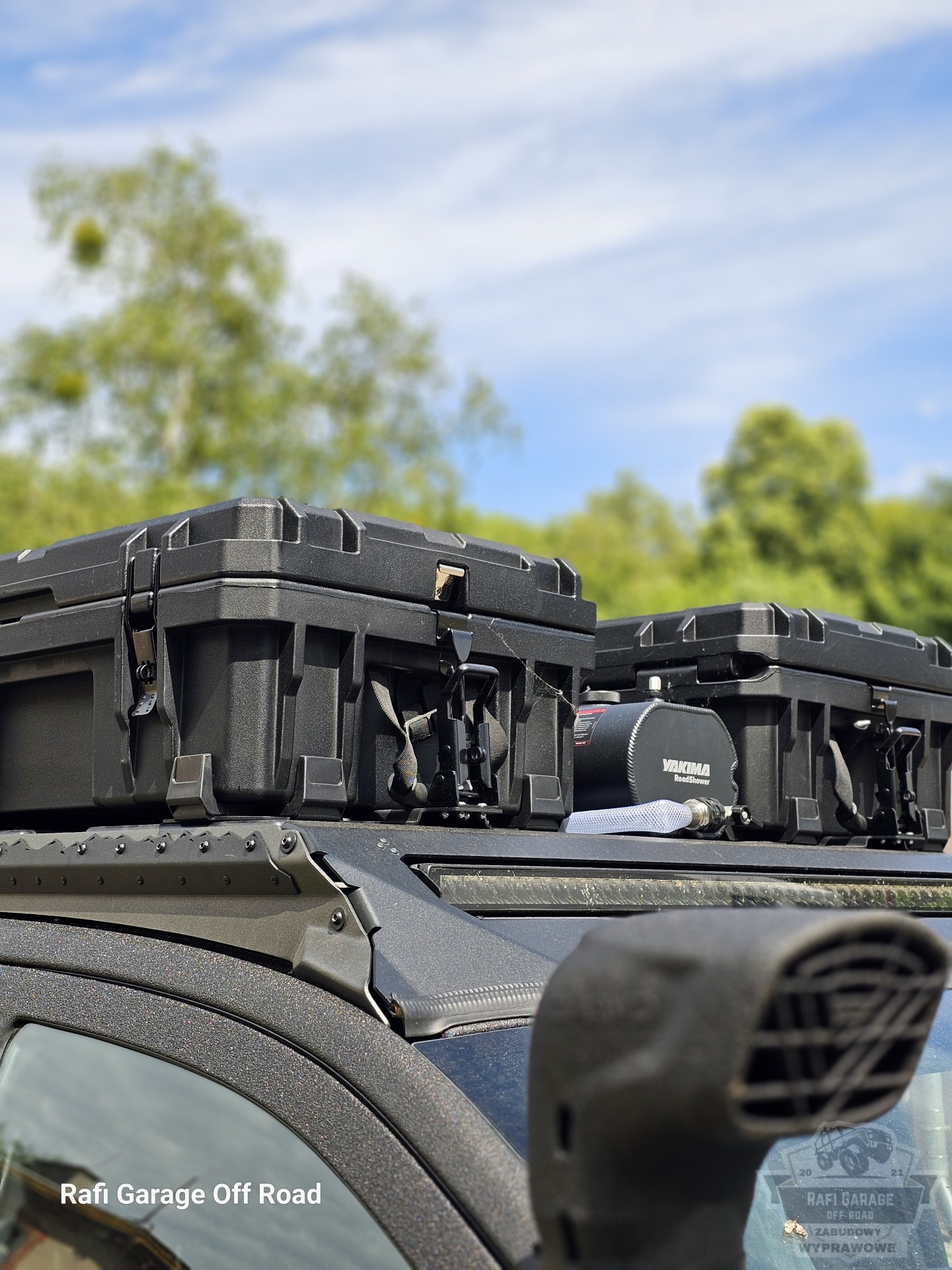 - Montaż zestawu dwóch kanistrów na wodę Rotopax z mocowaniami, kranikami oraz instalacją na konstrukcji na pace