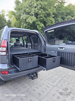 Zabudowa wyprawowa do Toyoty Land Cruiser 120 posiadająca dwie szuflady wraz z ruchomymi górnymi pokrywami spasowanymi z kształtem bagażnika. Jedna szuflada z przegrodami. Druga - kuchenna, modułowa w wersji mocno rozbudowanej. Z miejscem dla wyposażenia kuchennego w górnej części, następnie niezależna wysuwana platforma dla dwupalnikowej kuchenki turystycznej Olida wraz z miejscem na kartusze. Blat kuchenny będący polem odstawczym daje możliwość korzystania z niego przy pełnym wysuwie szuflady bądź jako blat roboczy przy wersji złożonej. Każdy element szuflady jest niezależny, posiadający blokady.