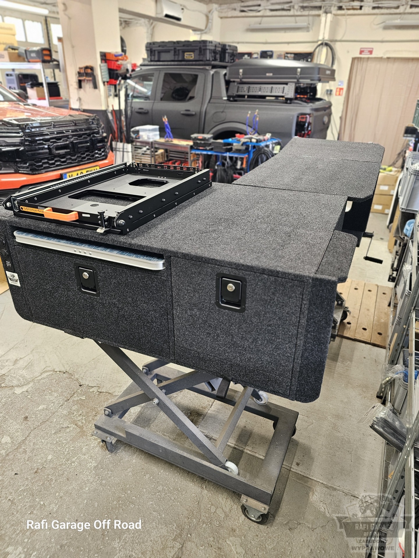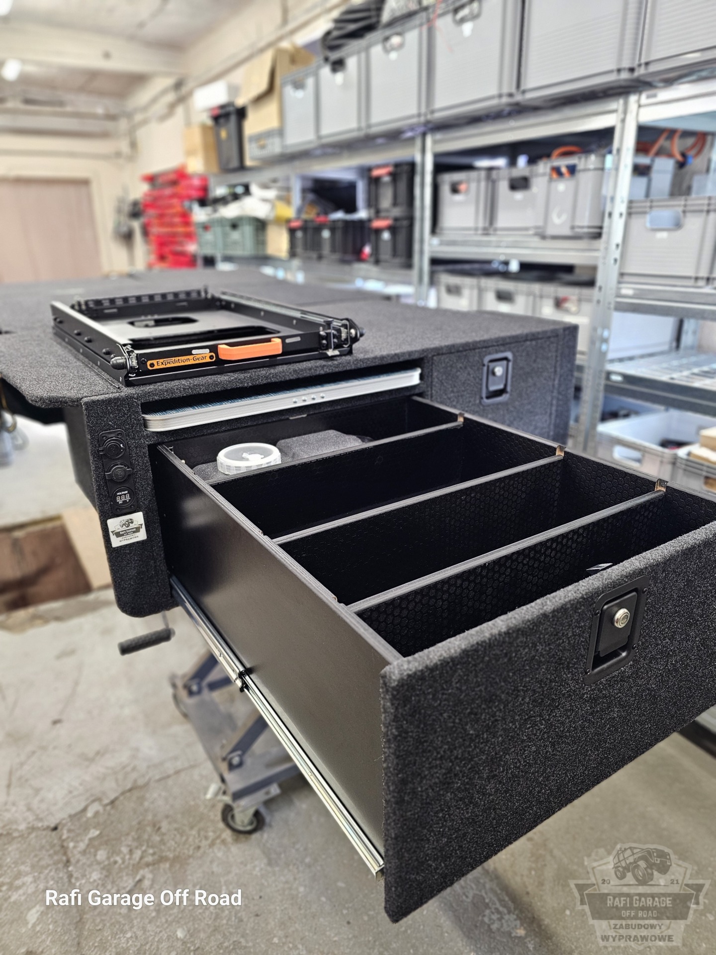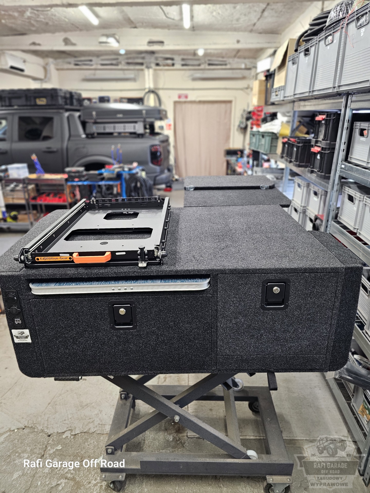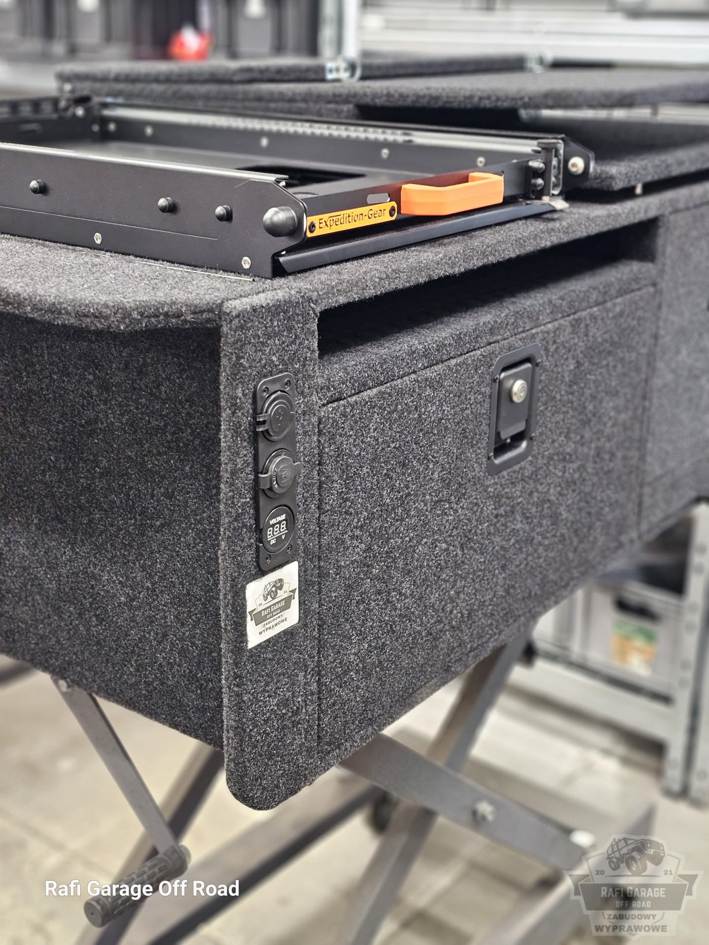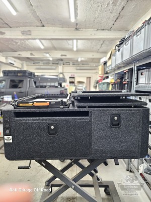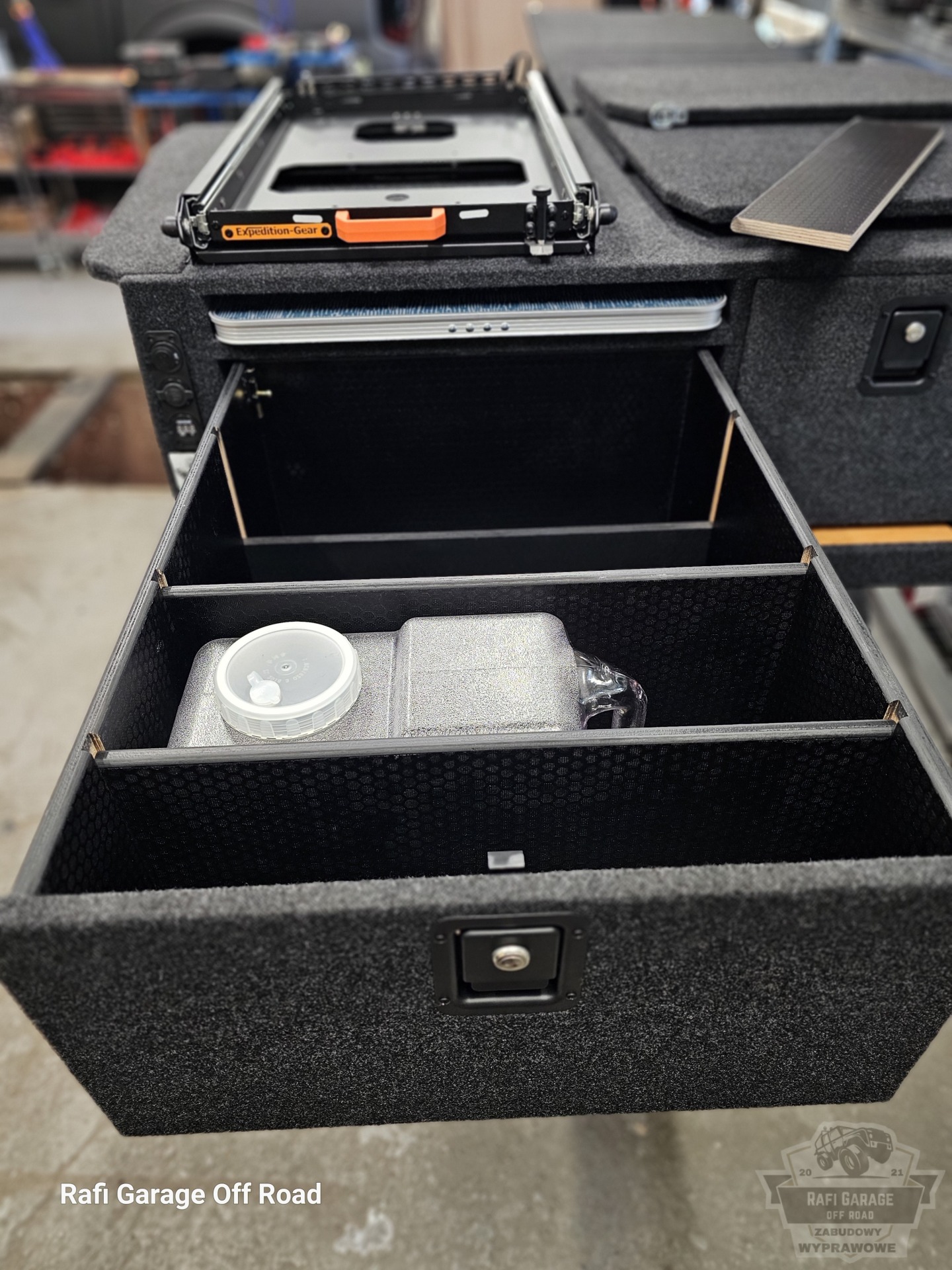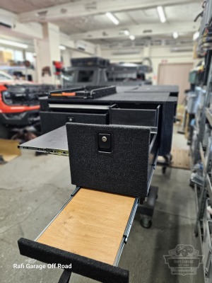 - Na zabudowie wychylna szuflada firmy Expedition-Gear pod lodówkę kompresorową