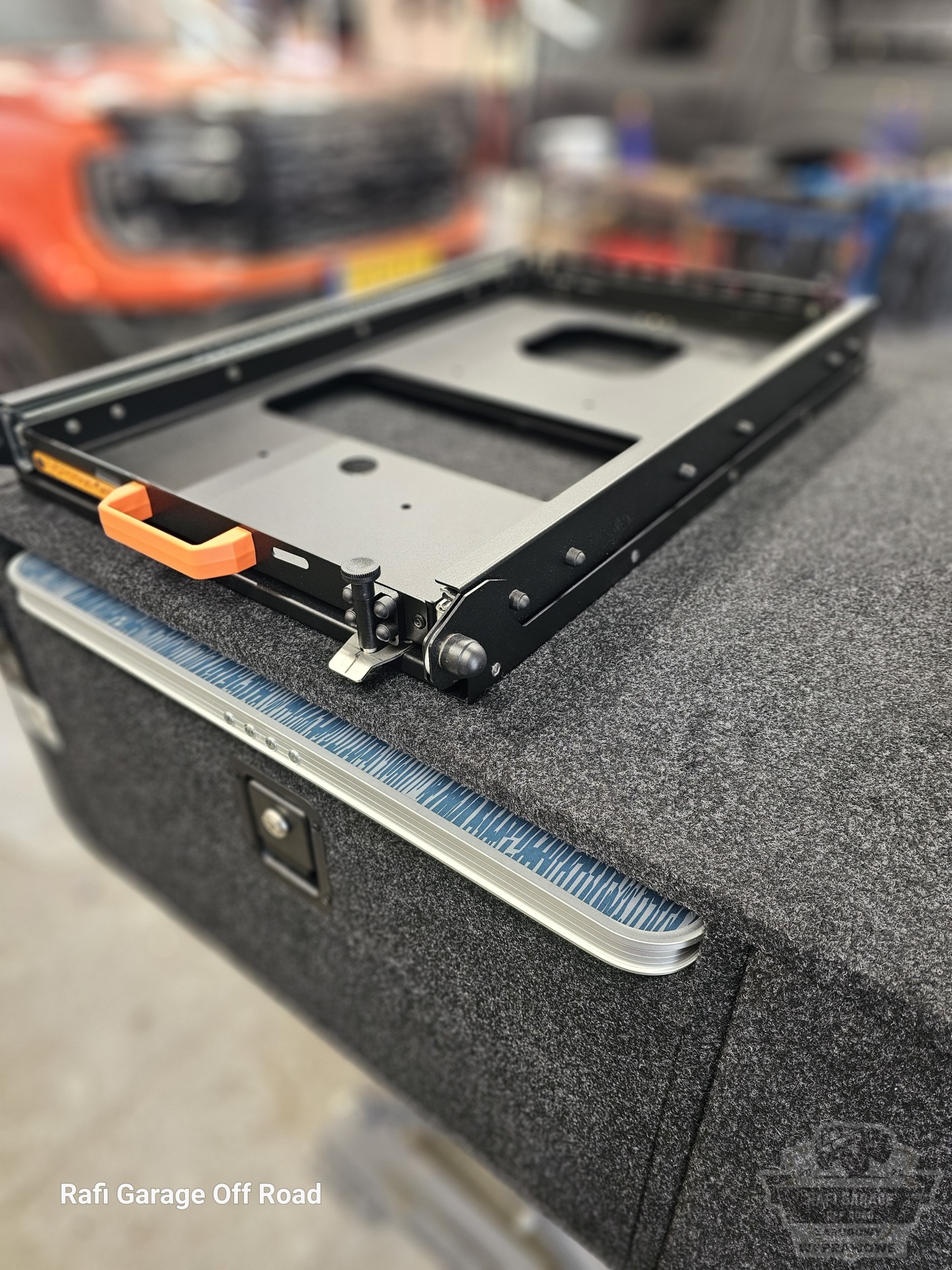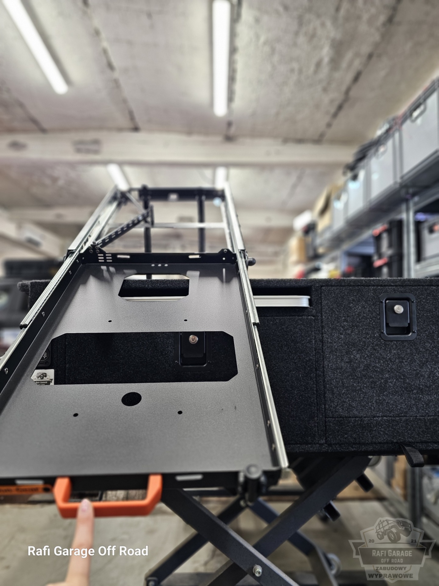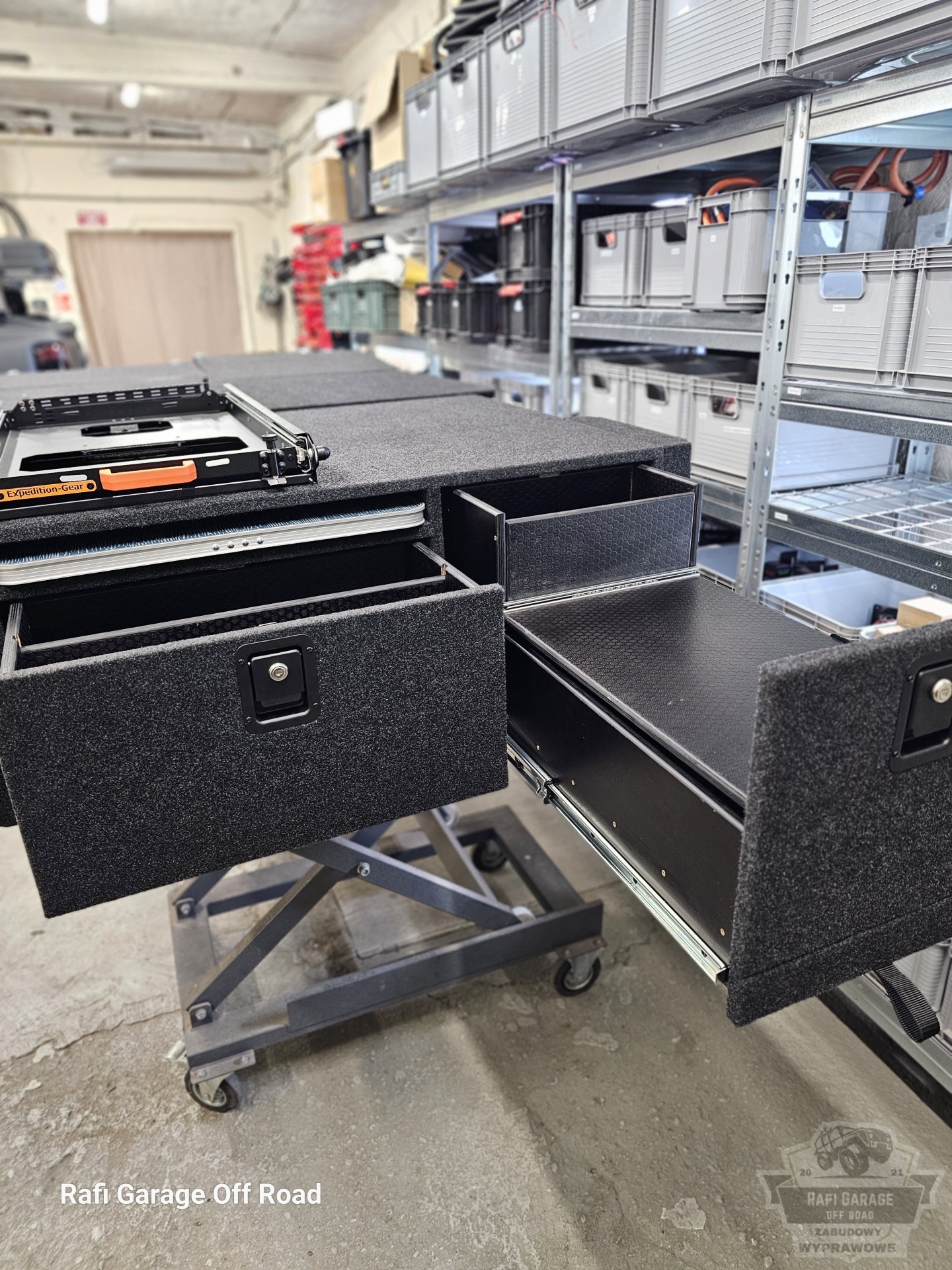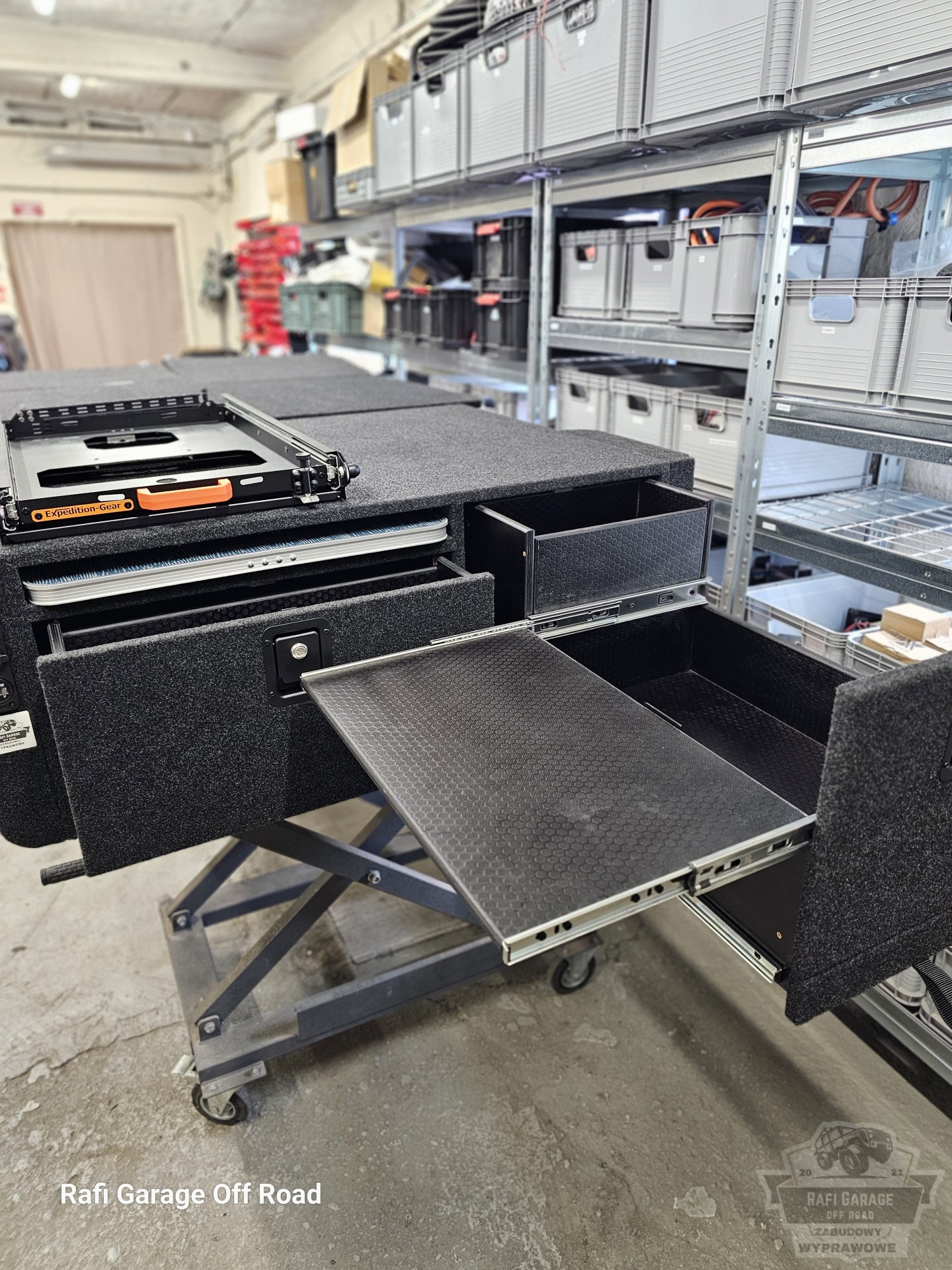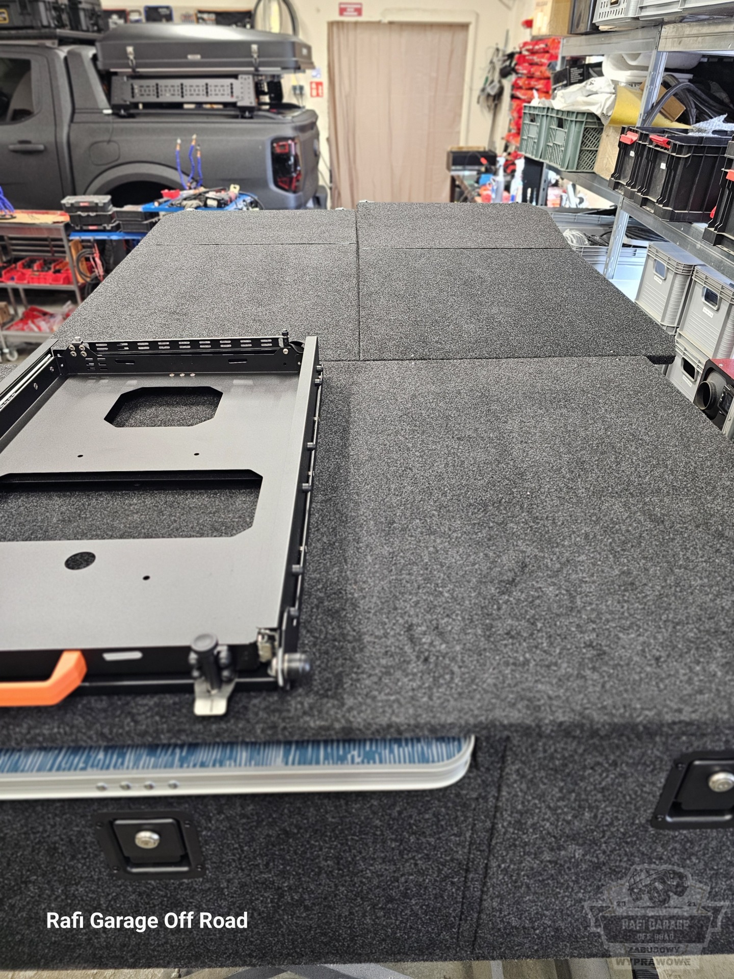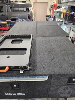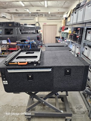 - Na zabudowie wychylna szuflada firmy Expedition-Gear pod lodówkę kompresorową