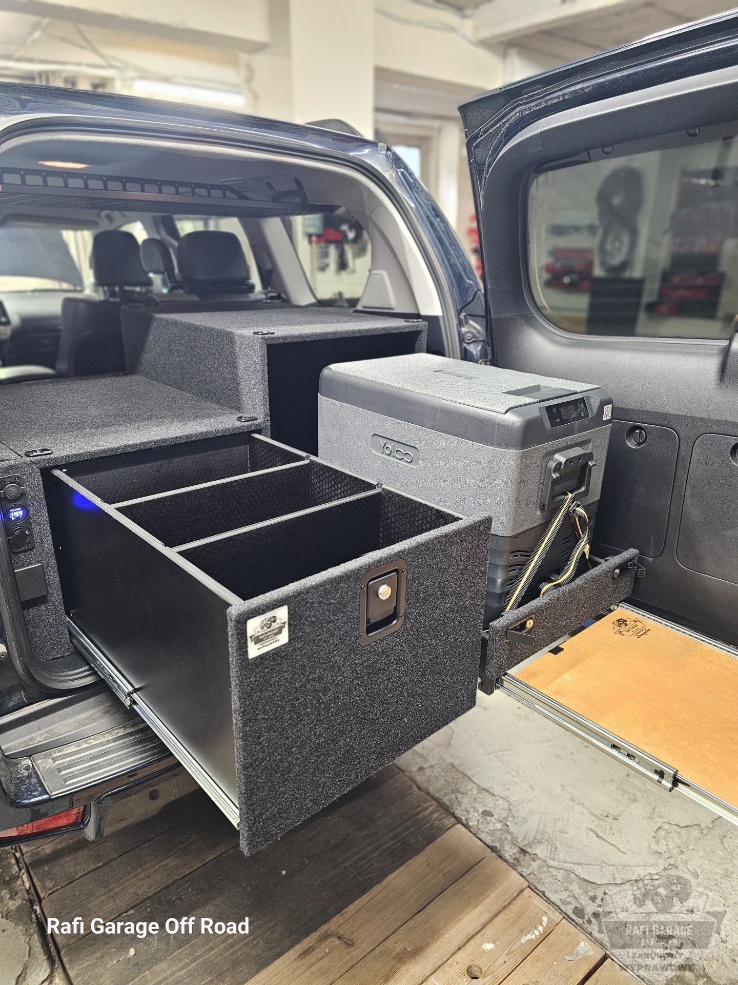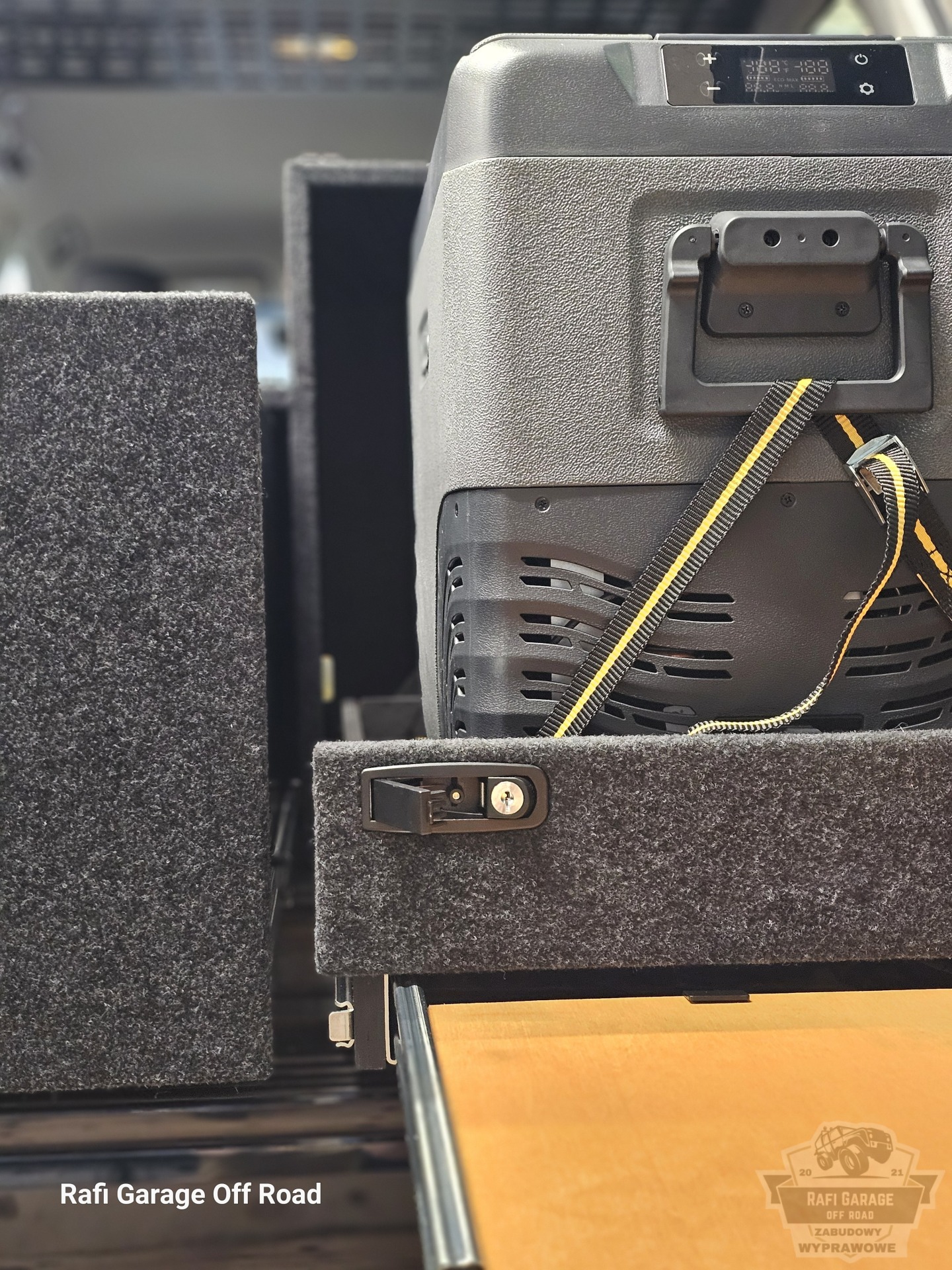 - Lewa strona: pojemna szuflada o wysokości 40 cm z systemem wyciąganych przegród, umożliwiających dowolną organizację sprzętu wyprawowego