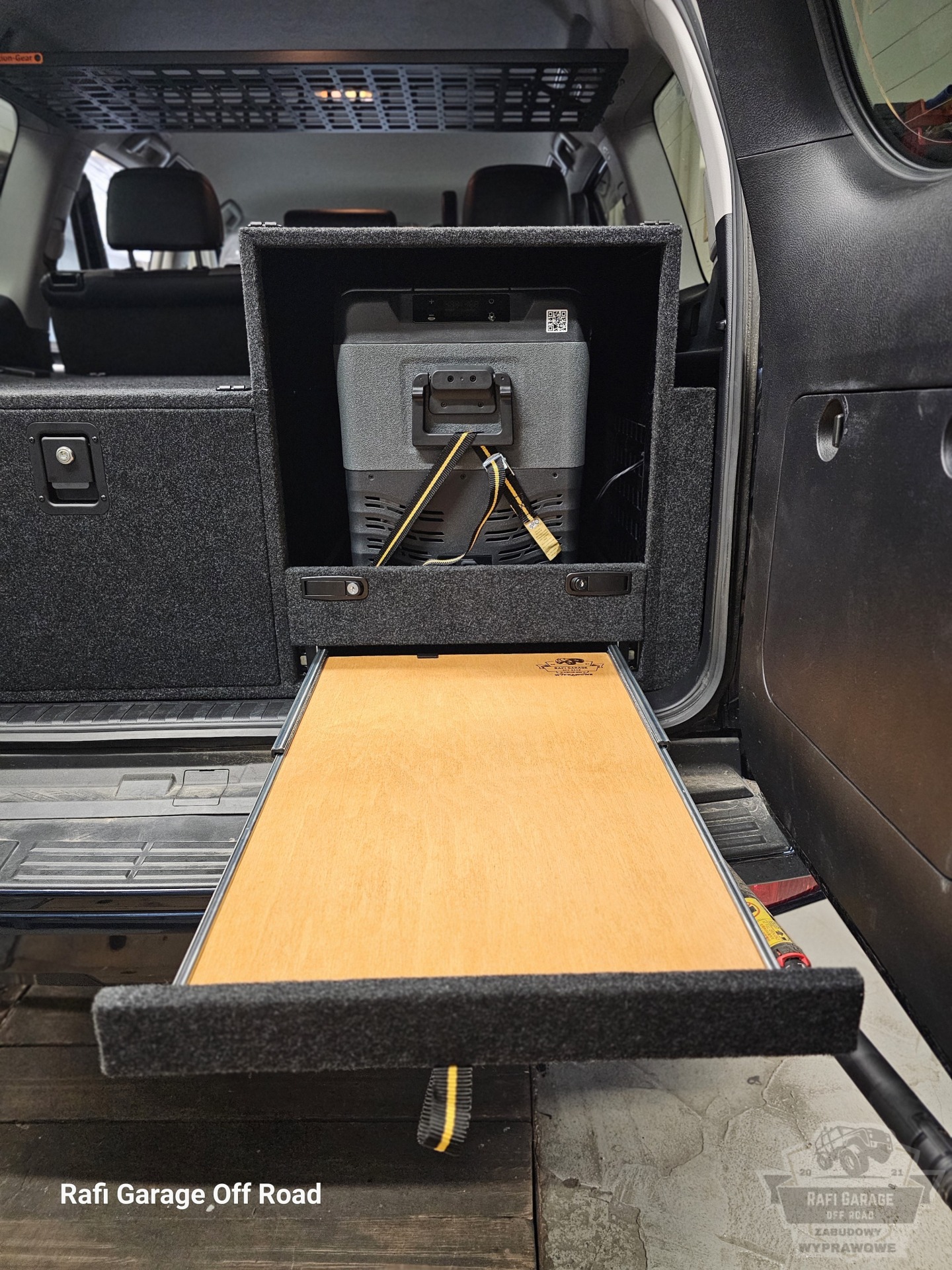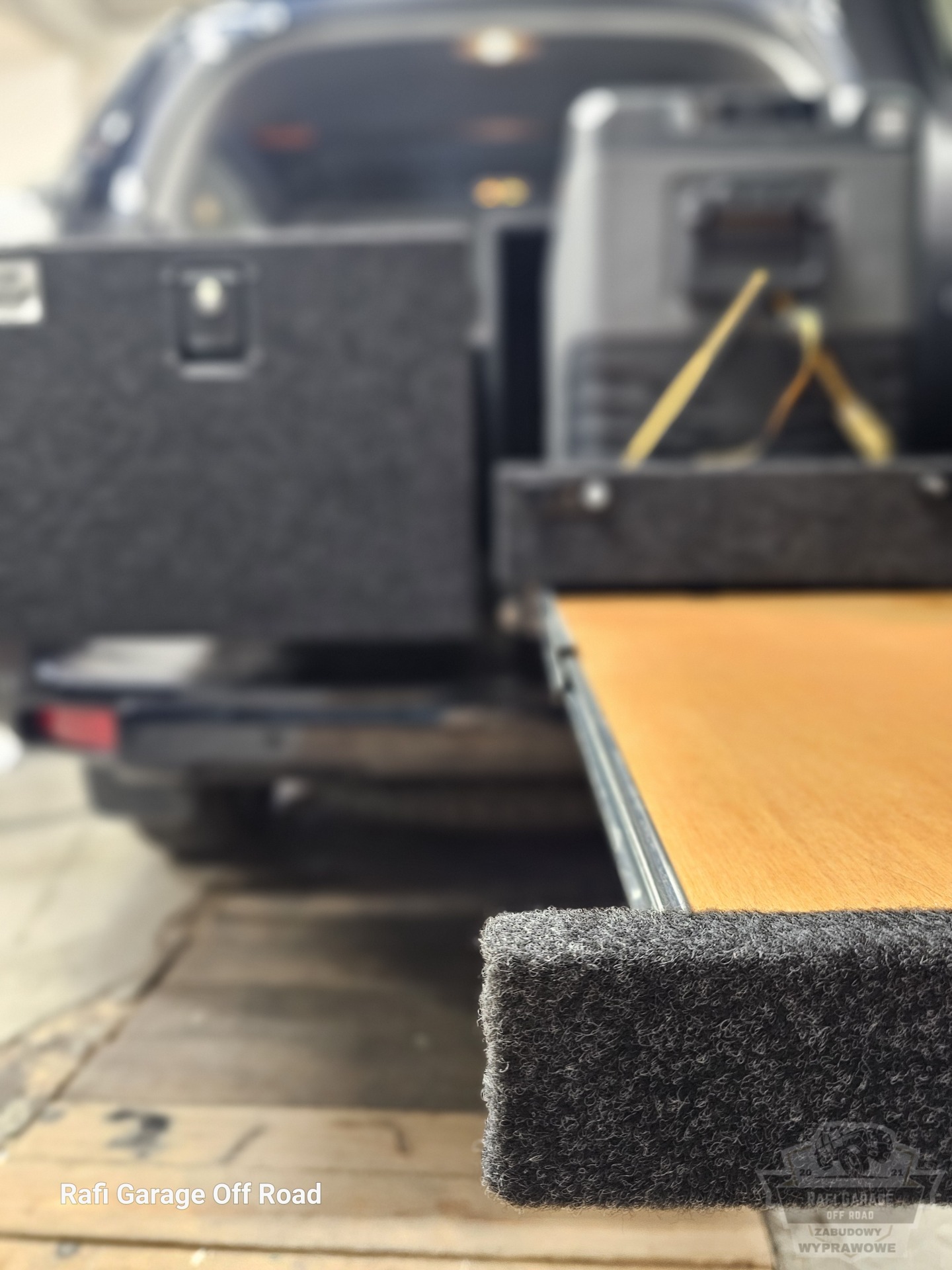 - Prawa strona: lakierowany, wysuwany blat roboczy – stabilne miejsce do przygotowania posiłku lub obsługi sprzętu w terenie
