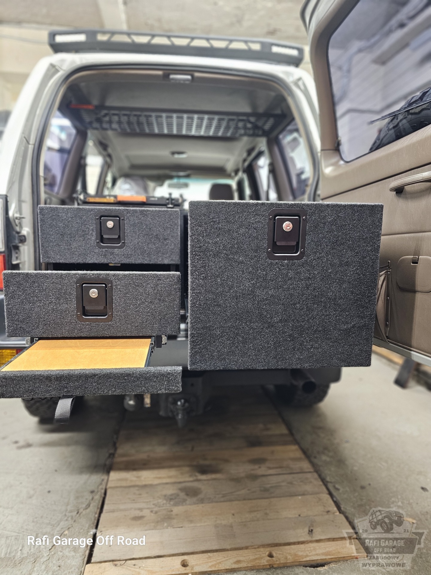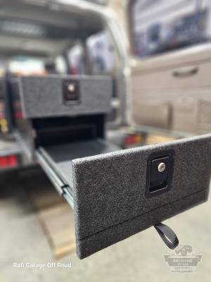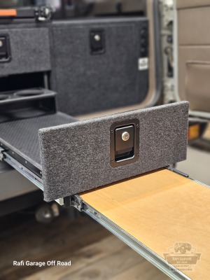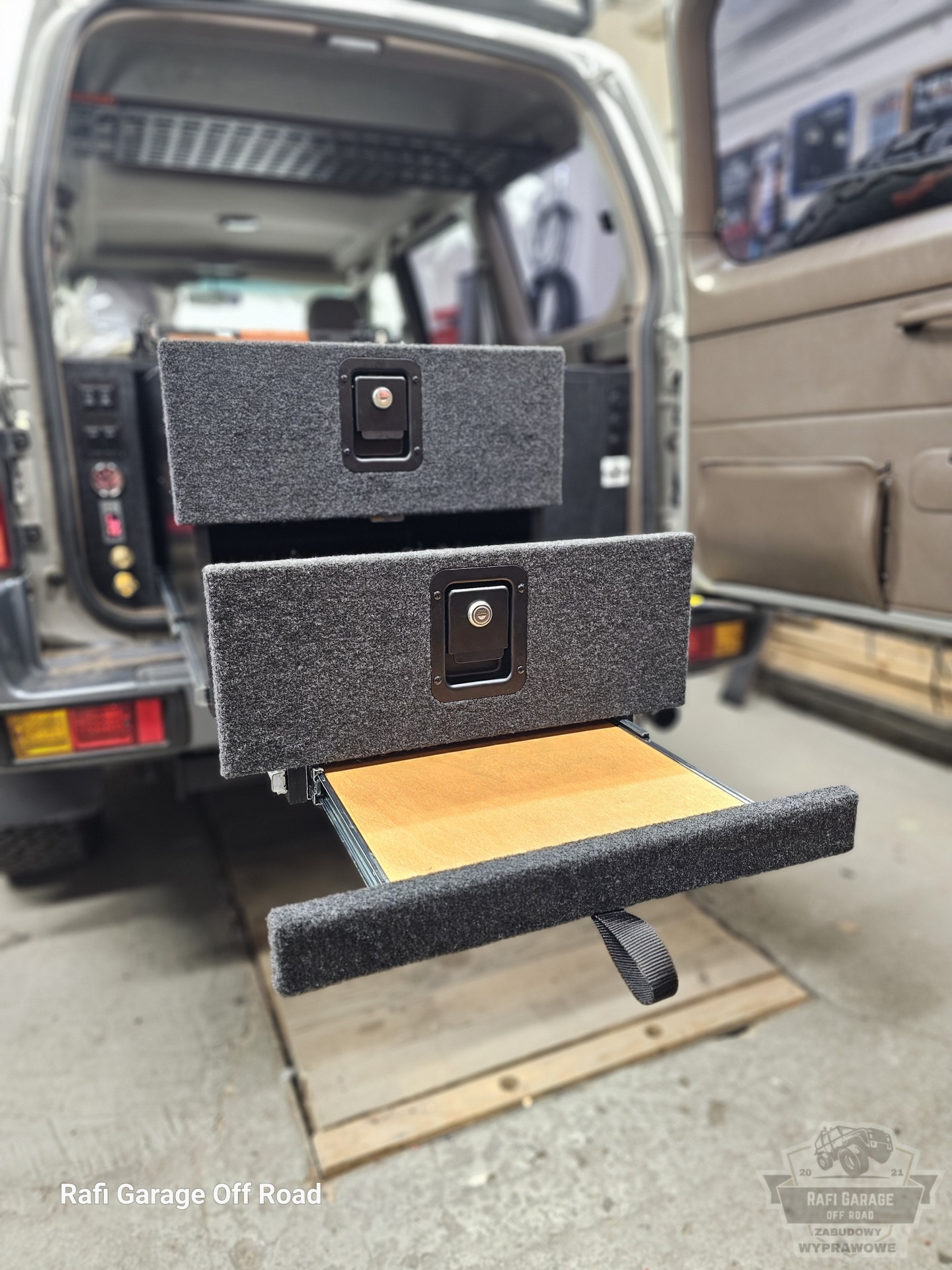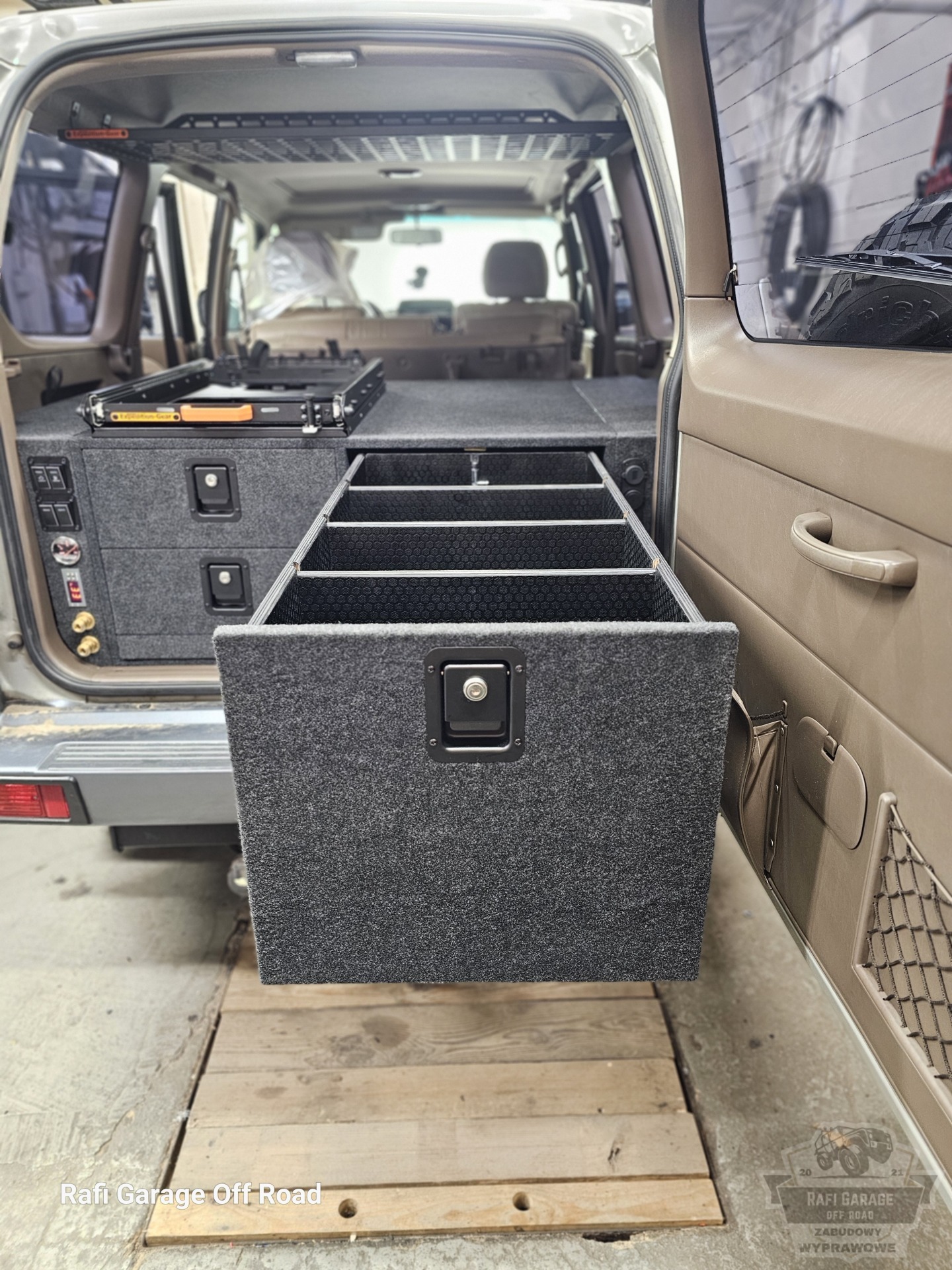 Projekt bazuje na sprawdzonym rozwiązaniu znanym z realizacji dla Toyota Land Cruiser 150, jednak został dopasowany do konkretnego pojazdu i potrzeb klienta. Zabudowa ma wysokość 44 cm i oferuje ergonomiczny dostęp do całej przestrzeni ładunkowej.