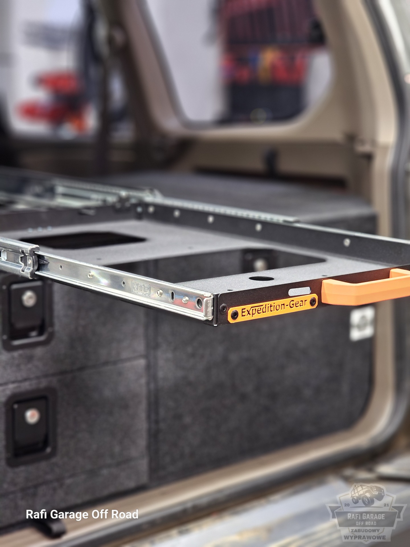 - montaż półki podsufitowej oraz szuflady Expedition Gear,