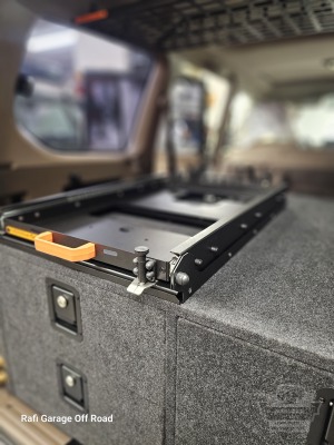 - Lewa szuflada (strona kierowcy) – system kuchenny 3w1 z miejscem na kuchenkę turystyczną oraz wysuwanym blatem roboczym, umożliwiającym wygodne przygotowywanie posiłków w terenie.