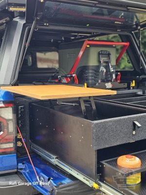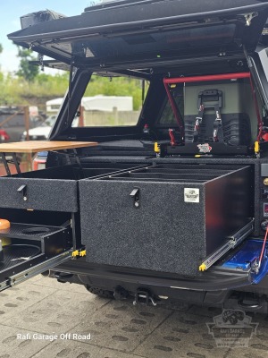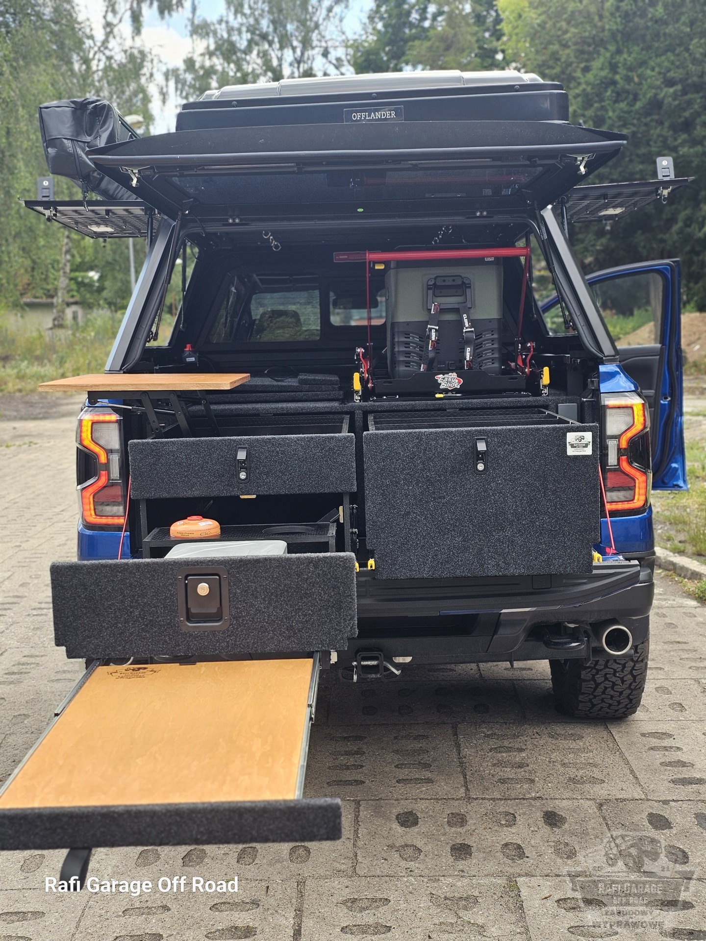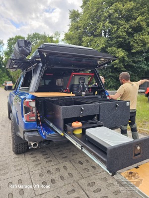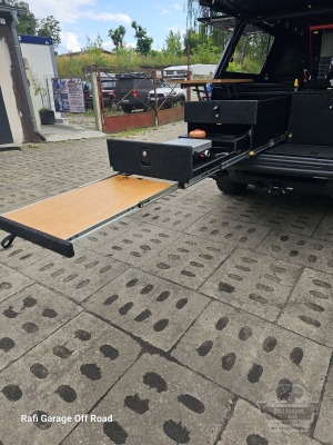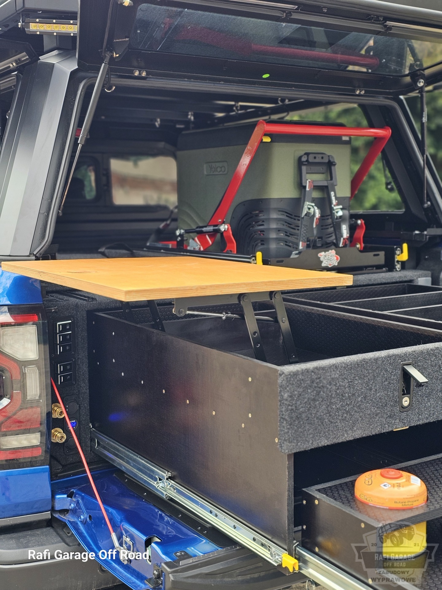 - Szuflada kuchenna - system 3w1 - Nasze najbardziej popularne i lubiane rozwiązanie. Każdy z element szuflady niezależny. Zalety szuflady: dodatkowy wychylny blat ; zorganizowane miejsce pod dwupalnikową kuchenkę turystyczną + miejsce na 0,5kg kartusze ; duży blat roboczy + podwieszany zlew