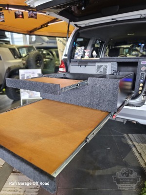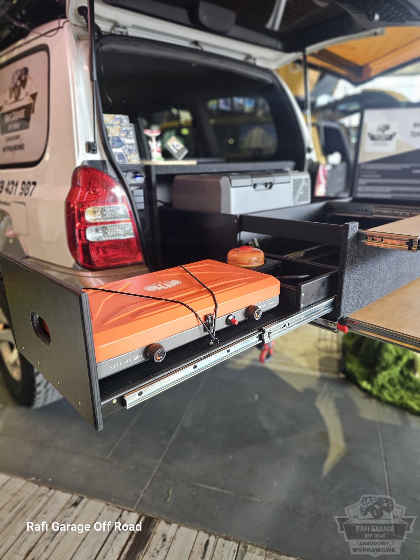 Od frontu mamy wysuwaną na bok platformę (szufladę) pod dwupalnikową kuchenkę turystyczną z miejscem na 0,5kg kartusz oraz schowek na przyprawy. Górną przestrzeń domyka wysuwany blat jako dodatkowa przestrzeń odstawcza lub/do przygotowania posiłków.