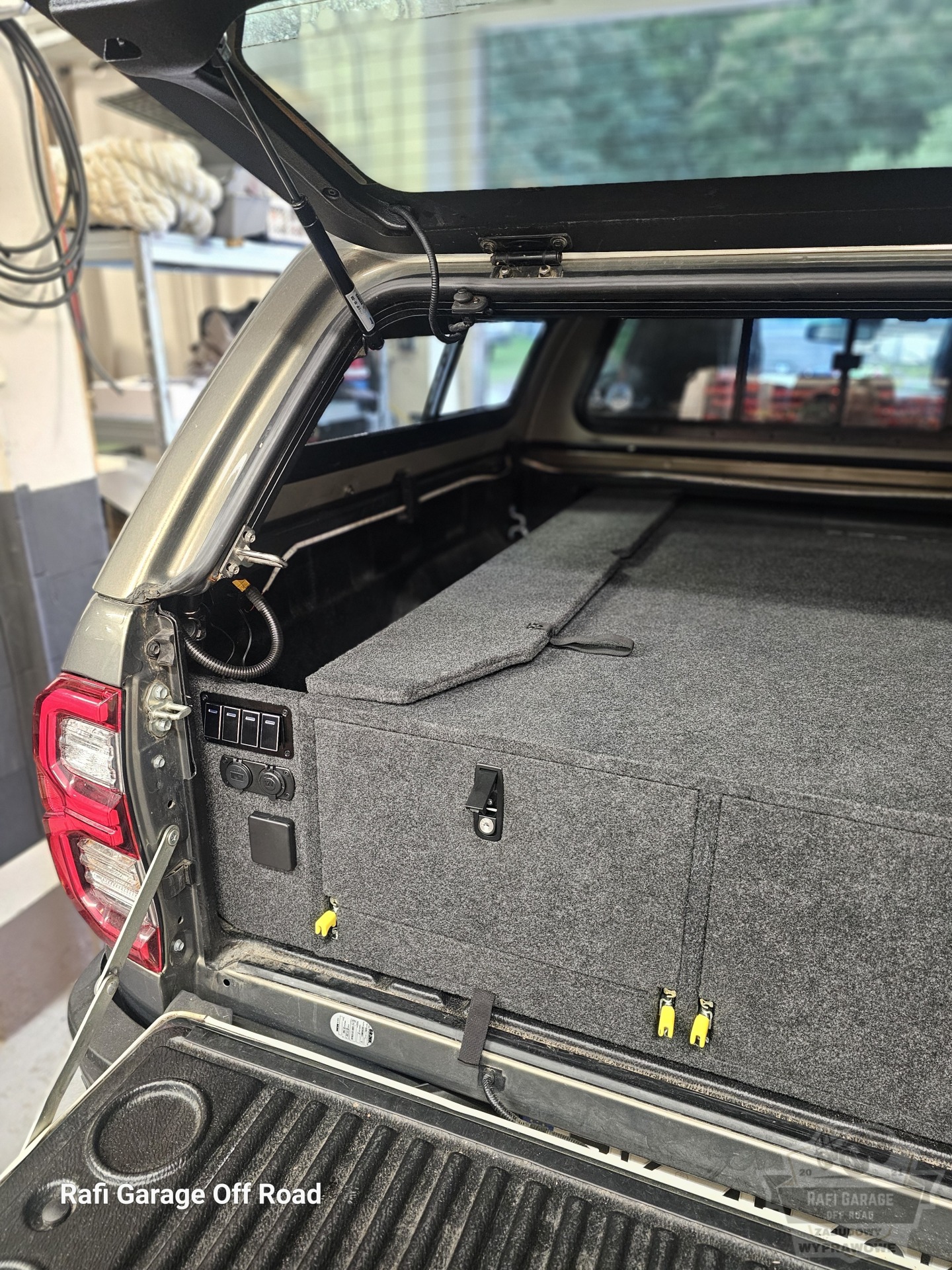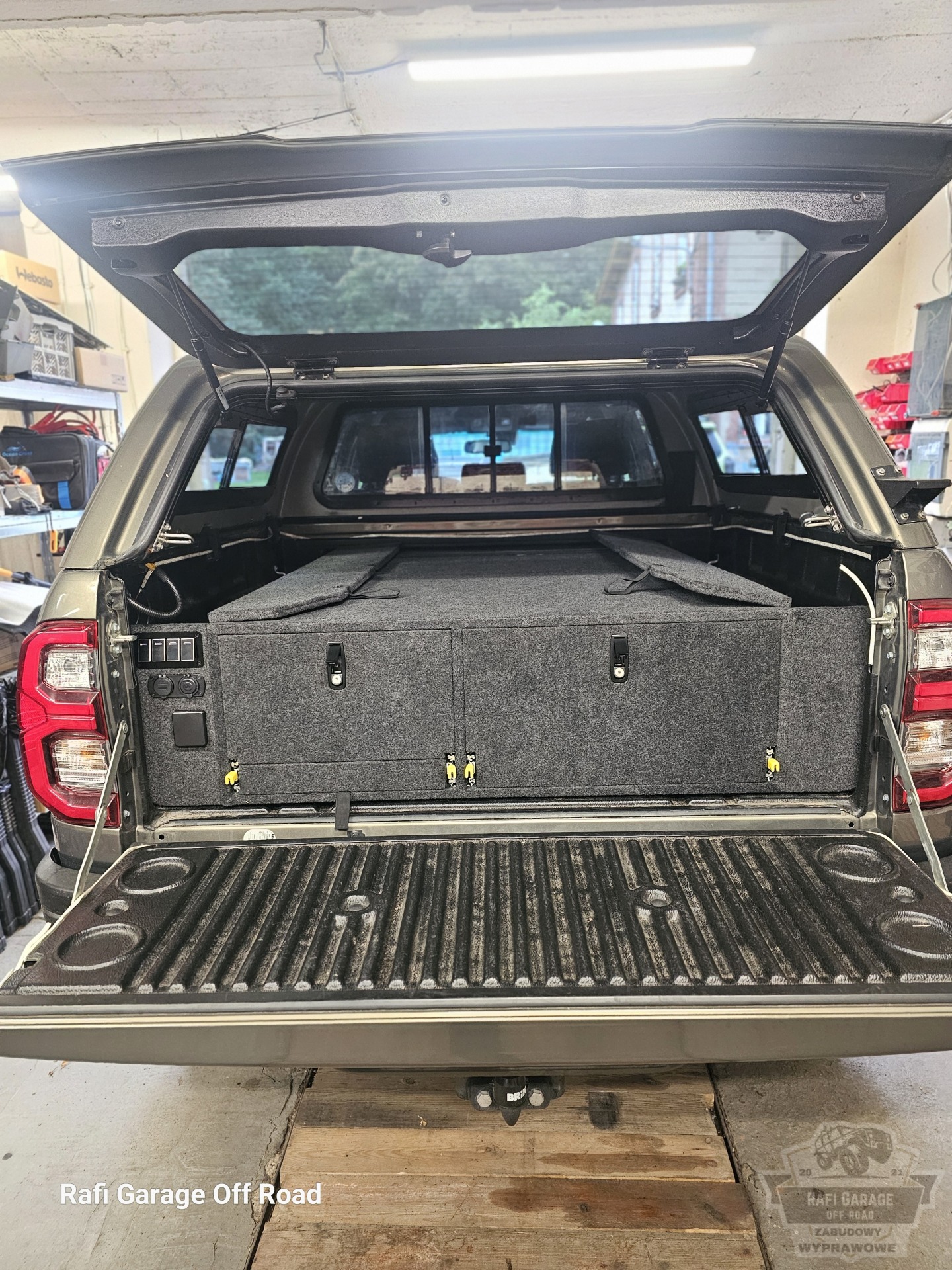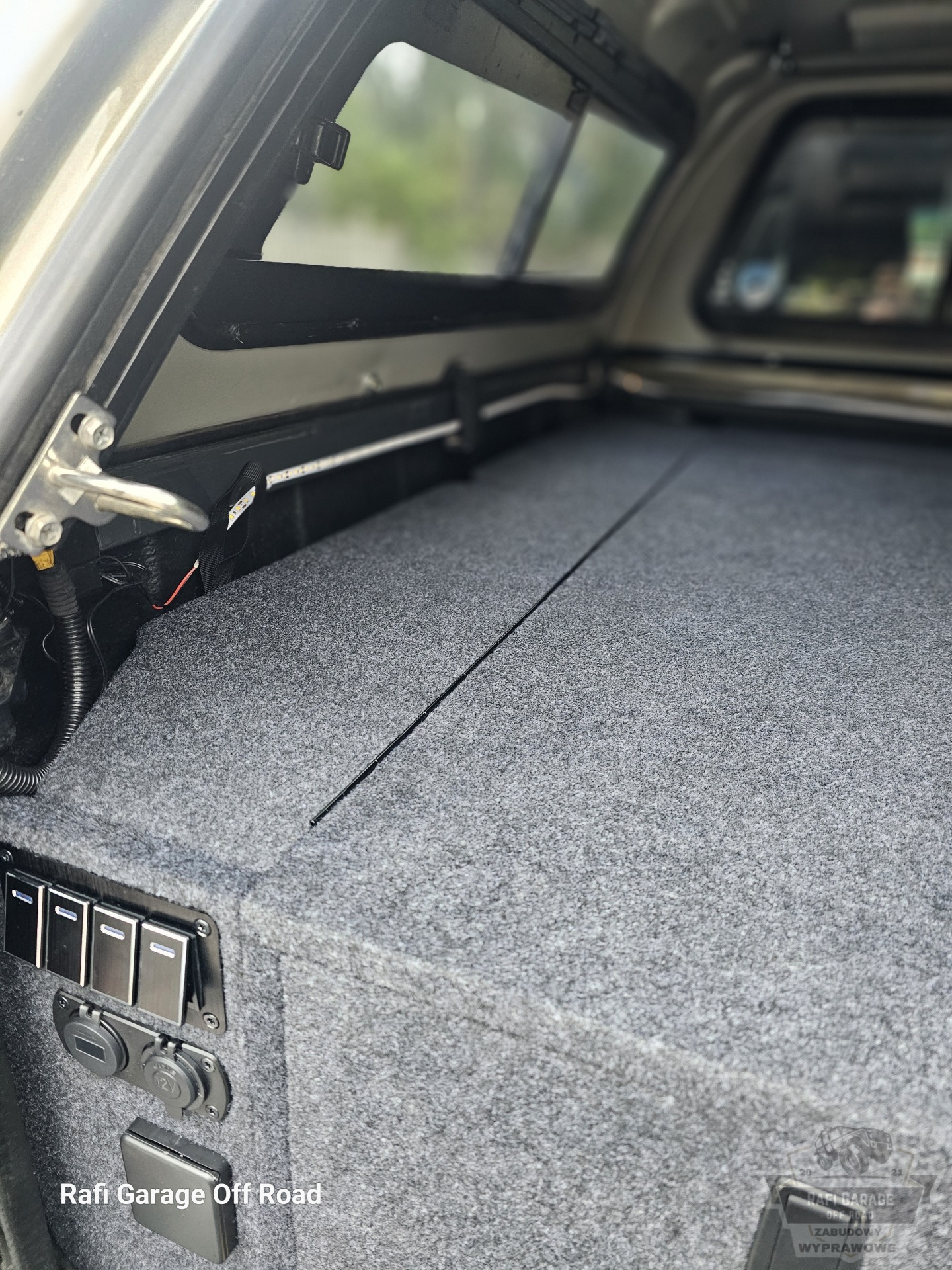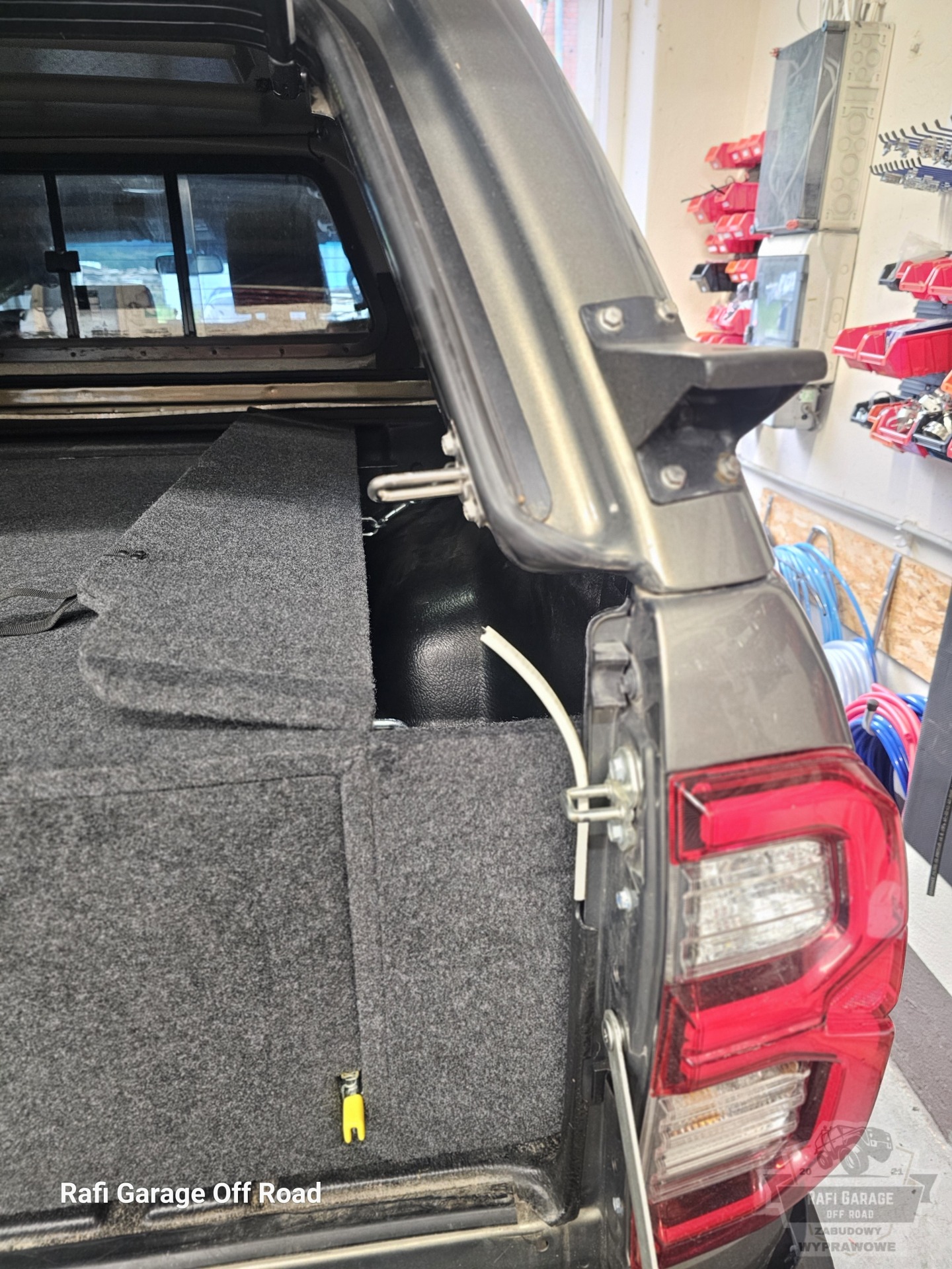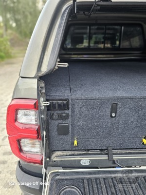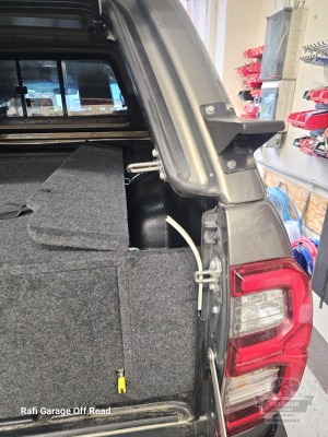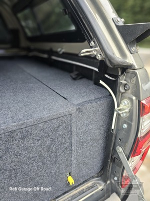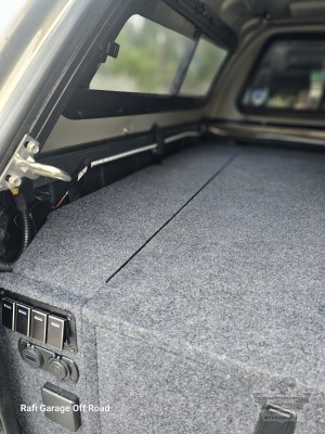Zabudowa paki do Toyota Hilux wykonana z wodoodpornej płyty tapicerowana w kolorze grafitowym. Zabudowa skrócona o 30 cm względem długości paki – pozostawiona przestrzeń pod przyszłą rozbudowę instalacji elektrycznej.