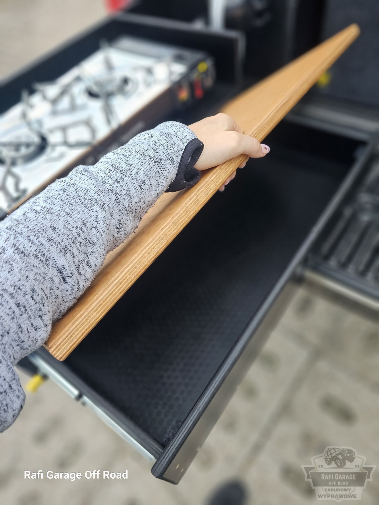 Zabudowa pod realne użytkowanie — gotowanie, woda, zasilanie i szybki dostęp do sprzętu.