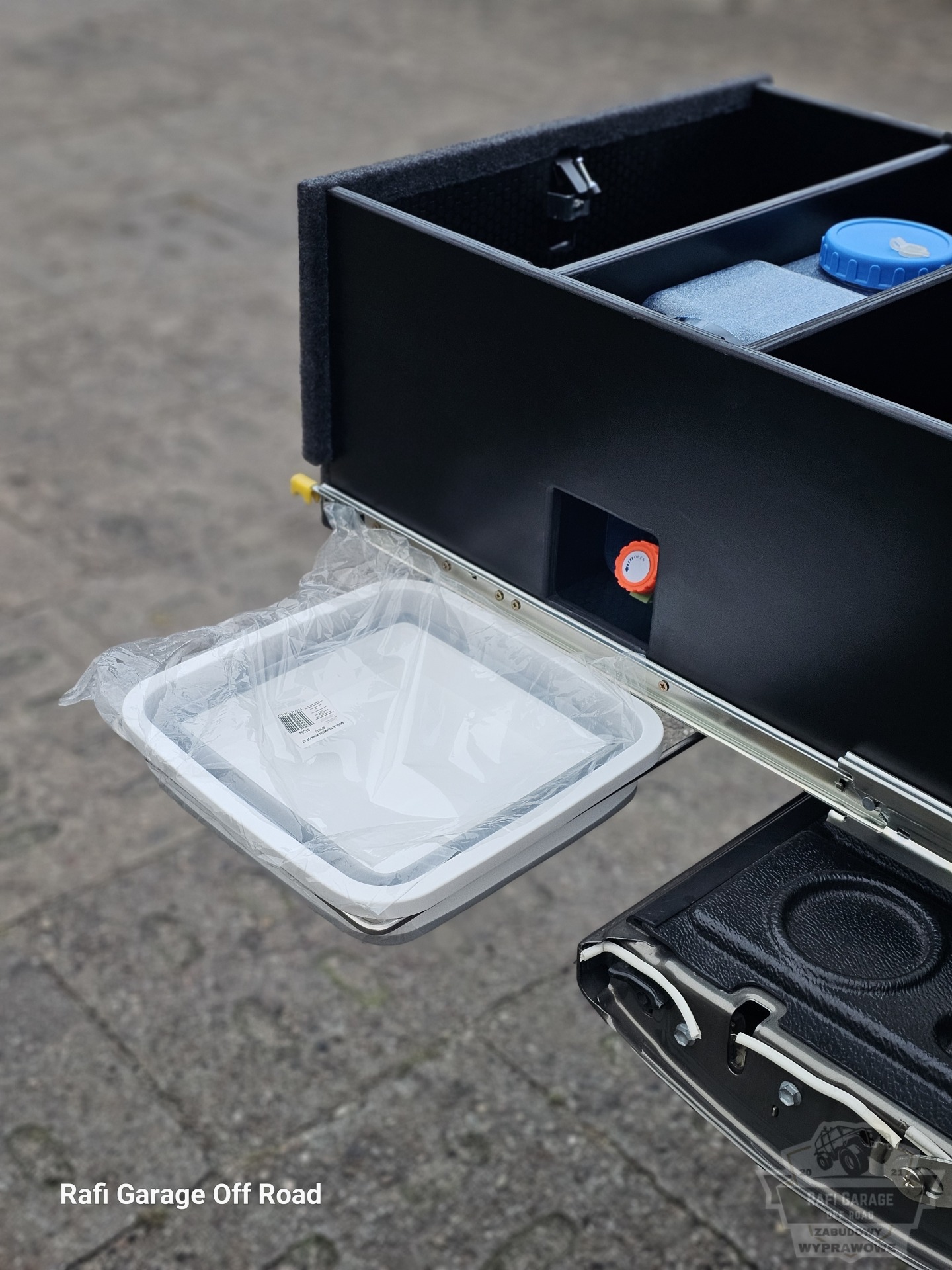Pod zabudową mocowanie zlewu (w zestawie: zlew + kanister 12L).
